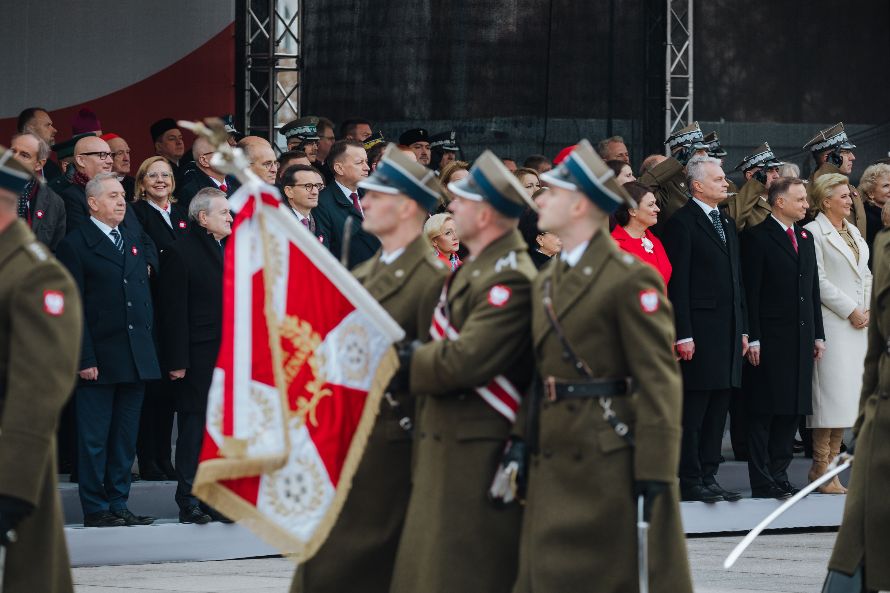 At the Marshal Józef Piłsudski Square, a Ceremonial Change of Guards and Memory Honour Roll Call were held. The Head of Government, together with the President of the Republic of Poland and other guests, sang the Polish Anthem. The President of Lithuania, Gitanas Nausėda, was also present. During the ceremony, the Prime Minister Mateusz Morawiecki laid flowers at the Tomb of Unknown Soldier and a wreath from the Nation at the Marshal Józef Piłsudski monument.
