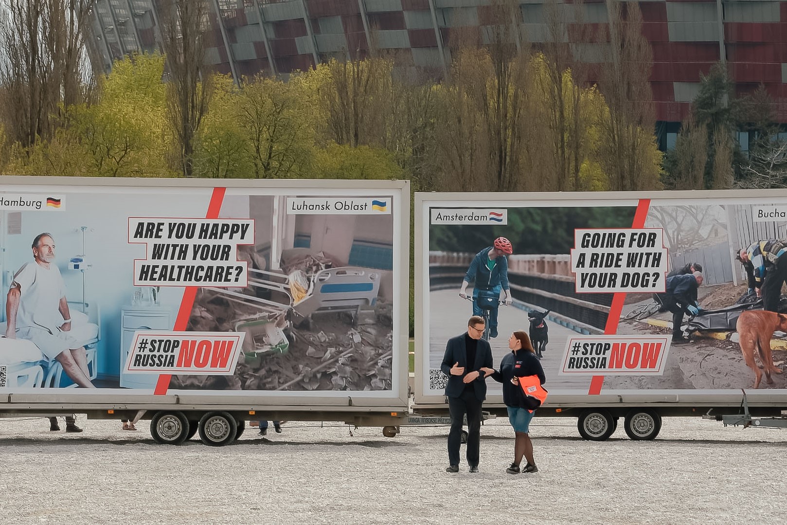 The special #StopRussiaNow campaign informs about the atrocities of war and the bestial killings by Russian soldiers in Ukraine. Billboards will appear in many European cities and include slogans in English and German, among others. The campaign will also be reinforced on social media.