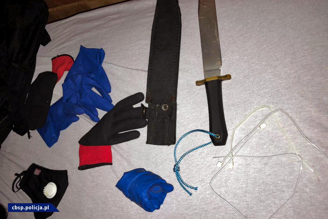 W toku przeszukania przeprowadzonego w domu jednorodzinnym będącym miejscem przebywania zatrzymanych osób ujawniono i zabezpieczono przedmioty jednoznacznie wskazujące na przygotowanie zatrzymanych do przestępstwa wzięcia zakładnika w celu uzyskania okupu. Funkcjonariusze Wydziału w Bielsku-Białej Zarządu w Katowicach Centralnego Biura Śledczego Policji ujawnili i zabezpieczyli szereg przedmiotów w postaci m. in. radiostacji Motorola wraz z zestawami słuchawkowymi, kamer służących do poglądu w trybie on-line, kominiarek, masek na twarz, elementów przebrania, noży, siekier, trzech sztuki broni, w postaci pistoletów marki Glock i marki „CZ” oraz rewolweru wraz z amunicją, paralizatorów, tzw. „trytytek” służących między innymi do krępowania rąk, taśm klejących, map dwóch miast z woj. małopolskiego, telefonów komórkowych i innych. Ponadto ujawniono i zabezpieczono kamerę przesyłającą w trybie on-line rejestrowany obraz, która była ukryta w drzewie ozdobnym znajdującym się na jednej z posesji. W wyniku powyższych działań ustalono dane osoby która miał być uprowadzona.