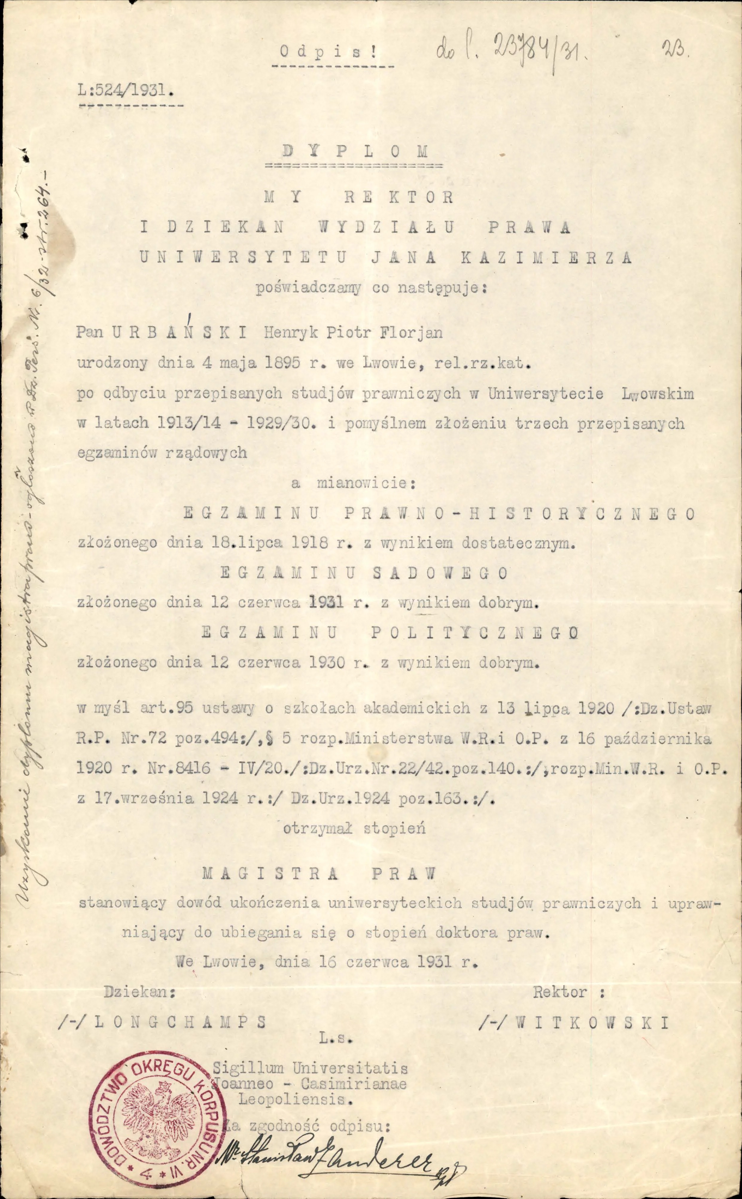 Mjr aud. Henryk Piotr Florian URBAŃSKI, syn Faustyna i Heleny z Rewakowiczów, urodził się 4 maja 1895 r. we Lwowie (obecnie Ukraina). Żonaty z Heleną z Gliksenów, ojciec dwójki dzieci.