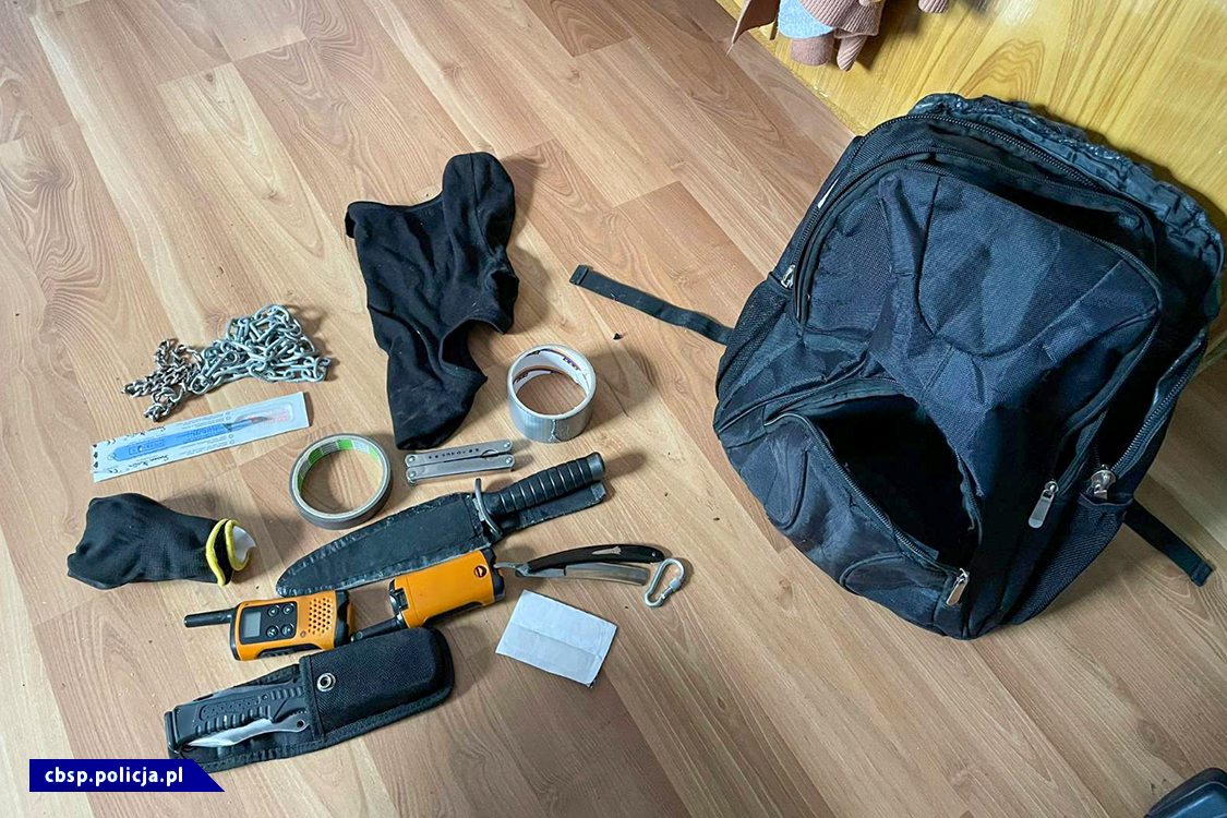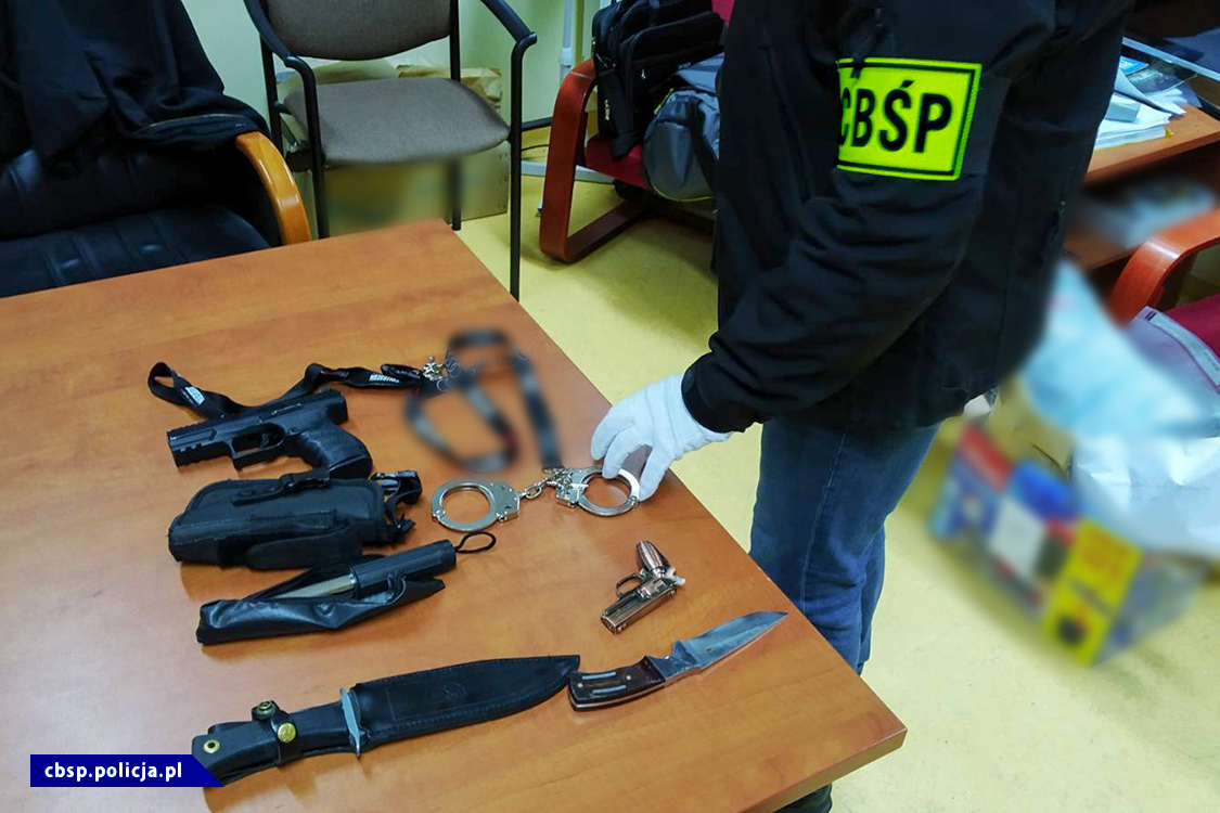 W trakcie przeszukania miejsc zamieszkania podejrzanych zabezpieczono kilkanaście noży taktycznych, specjalistycznych o różnej długości ostrza, a także 3 jednostki broni gazowej - noszące ślady przerabiania, pałki teleskopowe, kajdanki, ręcznie wykonaną kulę na sznurze tzw. „kiścień", kominiarki, 2 sygnalizatory błyskowe koloru niebieskiego, taśmy i sznury, krótkofalówki, odznakę policyjną, a także narkotyki.