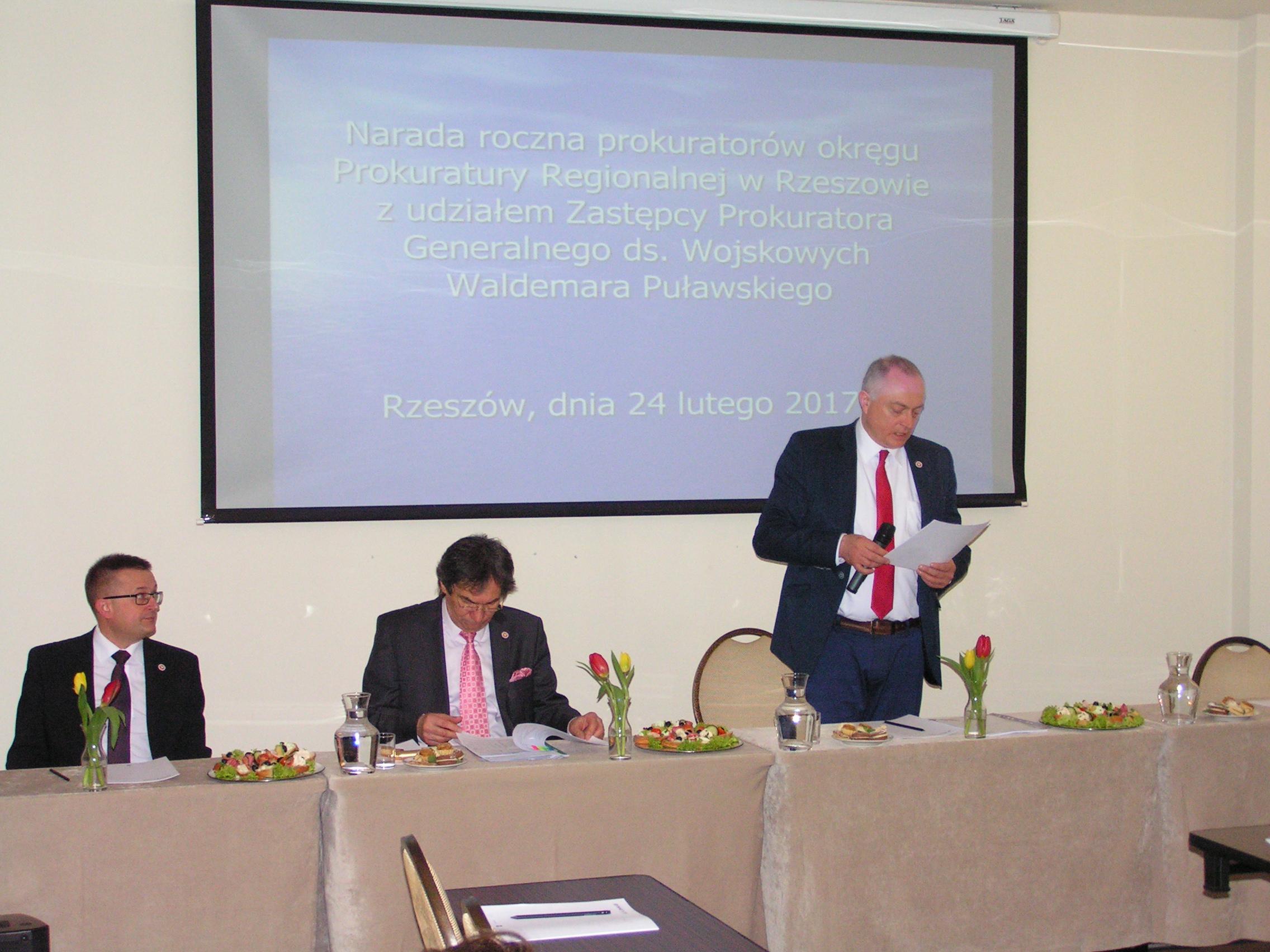 24 lutego 2017 r. odbyła się narada roczna prokuratorów regionu rzeszowskiego poświęcona omówieniu i ocenie pracy jednostek prokuratury podległych Prokuratorowi Regionalnemu w Rzeszowie.W naradzie uczestniczyli: Zastępca Prokuratora Generalnego do Spraw Wojskowych — Waldemar Puławski, Prokurator Regionalny w Rzeszowie — Jerzy Dybus, Zastępca Prokuratora Regionalnego — Adam Fida, Prokuratorzy Okręgowi, Prokuratorzy Rejonowi oraz prokuratorzy z regionu rzeszowskiego.
