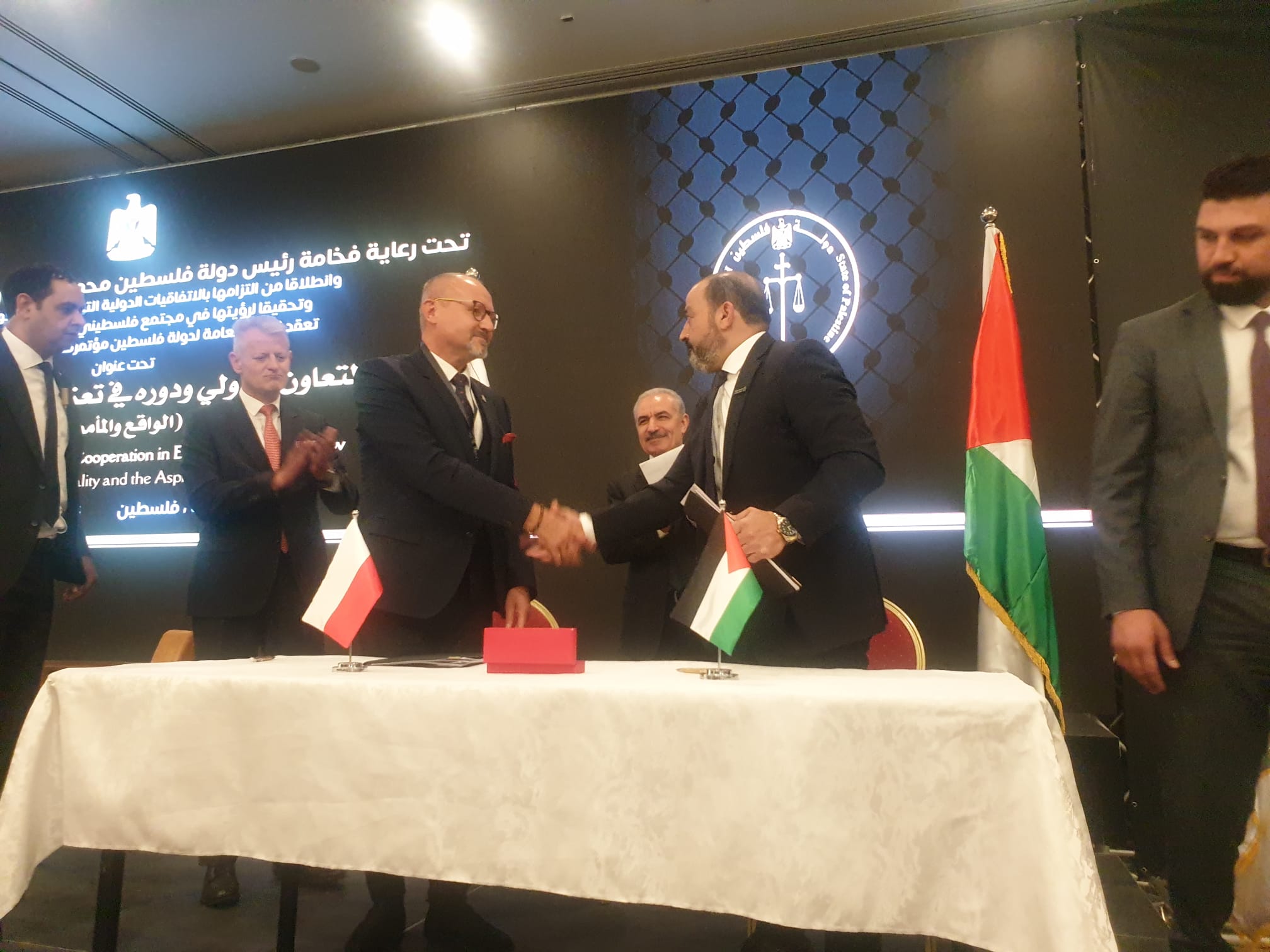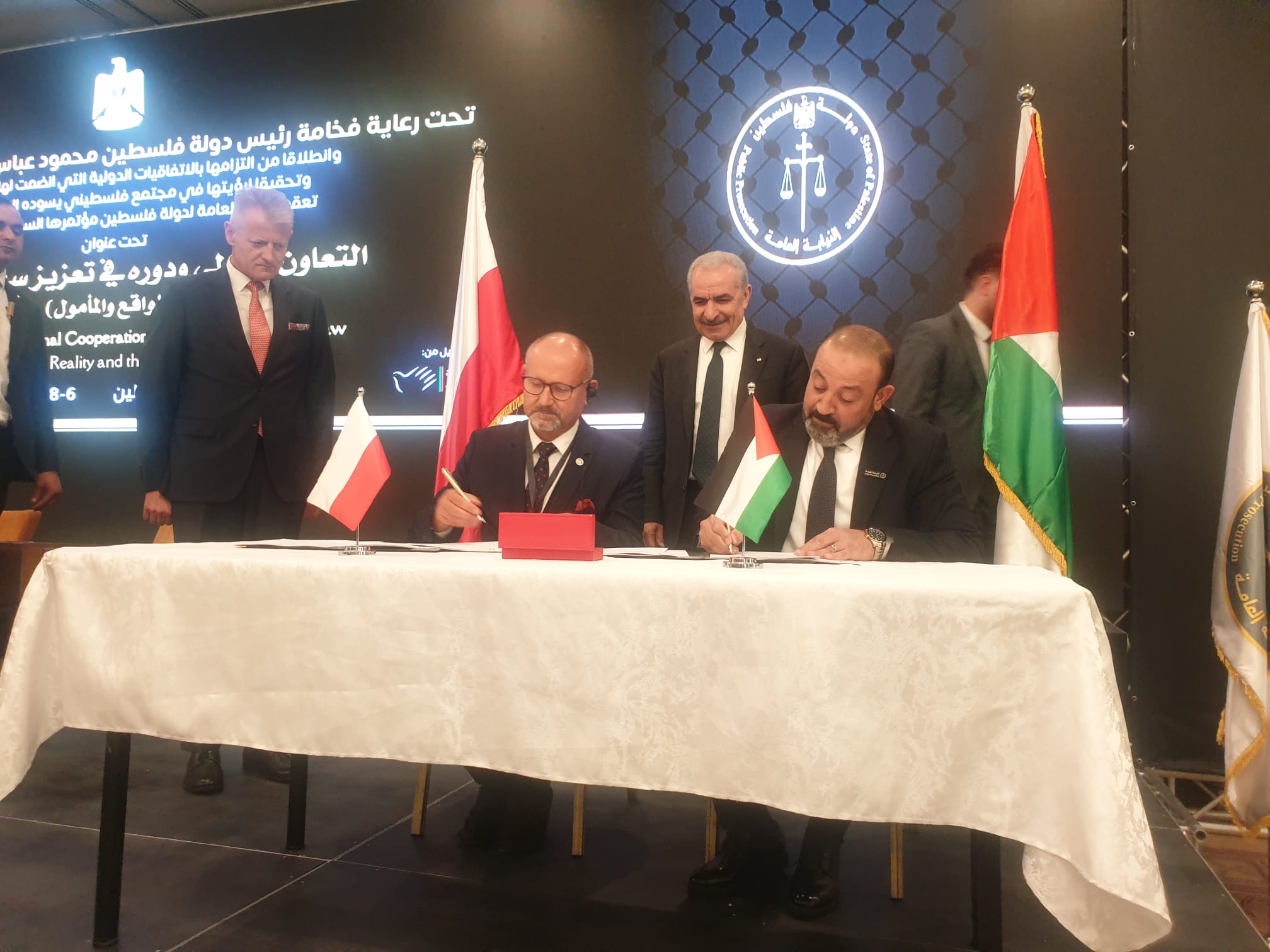 Prokurator Krajowy Dariusz Barski i Prokurator Generalny Palestyny Akram Alkhatib w obecności Premiera Palestyny Mohammeda Sztajeha podpisali w czwartek w Ramallah Memorandum o współpracy pomiędzy Prokuraturą Krajową Rzeczypospolitej Polskiej a Prokuraturą Palestyny dotyczące współpracy sądowej w sprawach karnych.