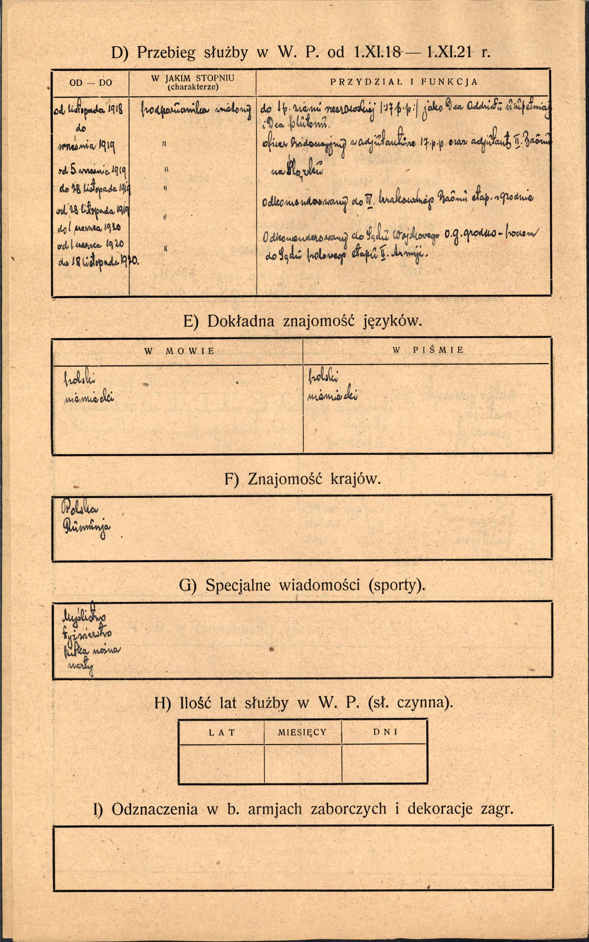 14 listopada 1918 r. wstąpił do Wojska Polskiego. 26 grudnia 1920 r. mianowany na stopień porucznika w korpusie oficerów piechoty ze starszeństwem od 1 kwietnia 1920 r.