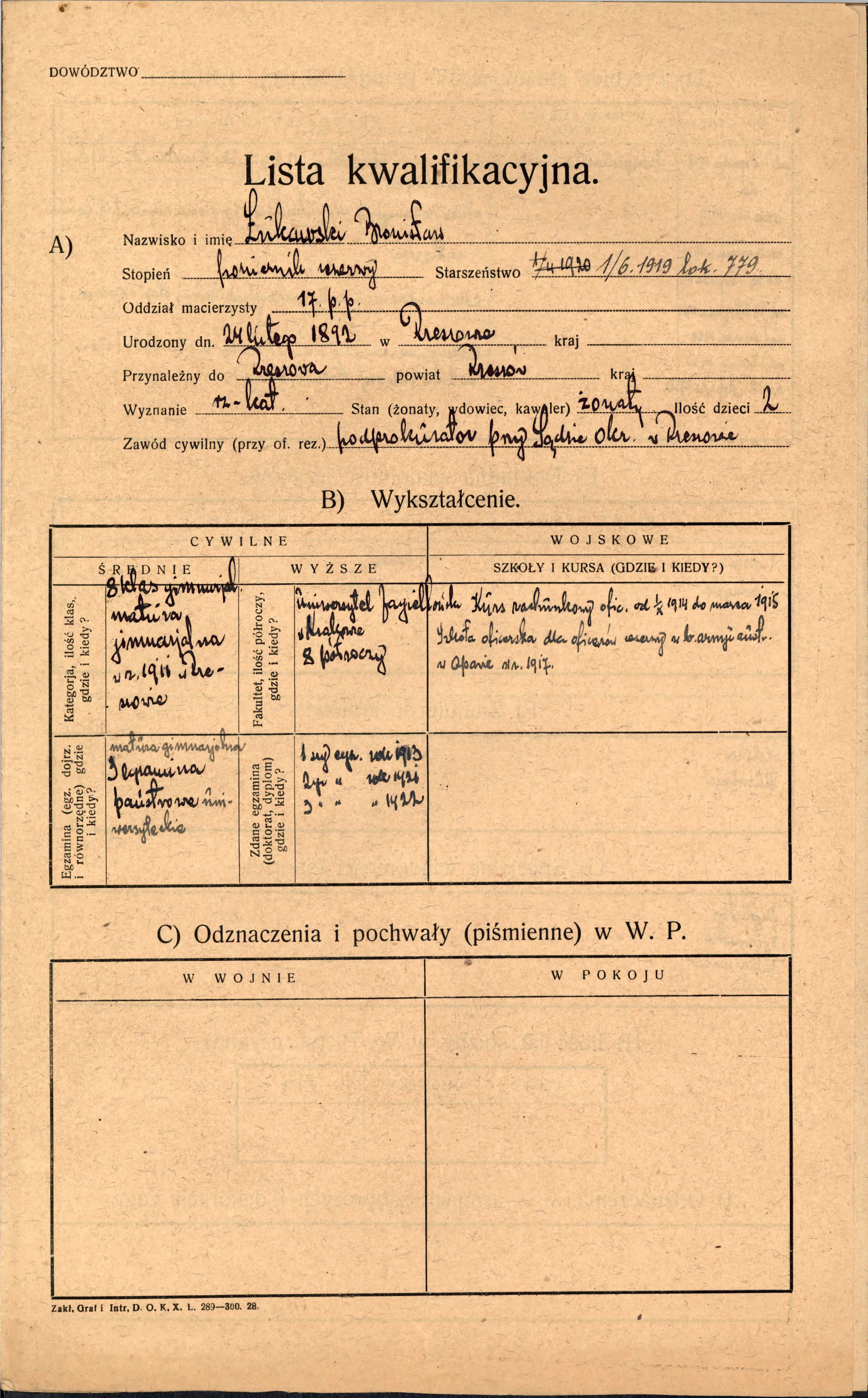 Por. rez. dr praw Bronisław Marian ŁUKAWSKI, syn Jana i Anny, urodził się 24 lutego 1892 r. w Rzeszowie. Żonaty z Janiną z d. Staszczakówną, ojciec dwójki dzieci.