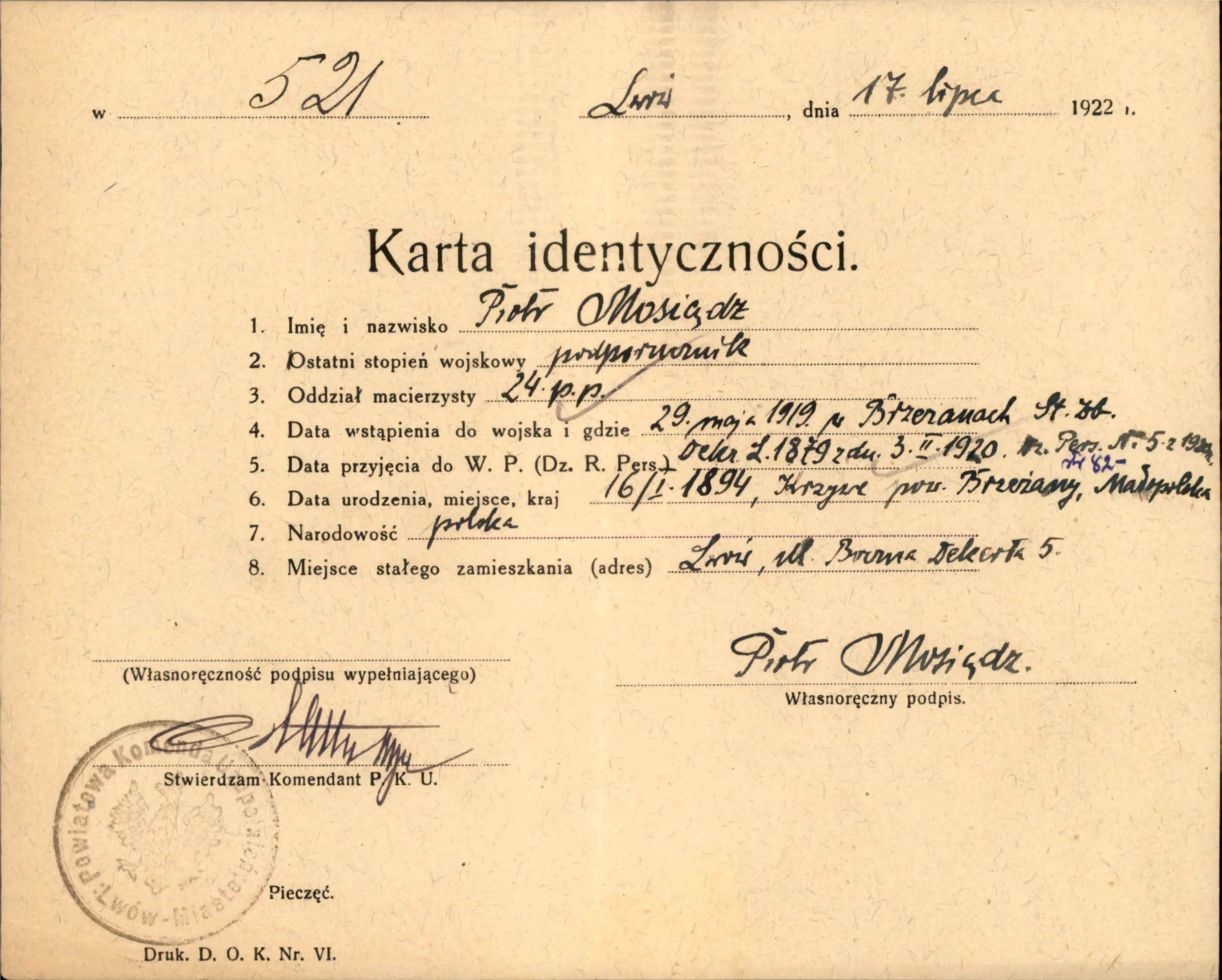 Ppor. Piotr MOSIĄDZ, syn Antoniego i Józefy z d. Skulska, urodził się 16 stycznia 1894 r. w Krzywem, powiat Brzeżany, w Galicji (obecnie obwód tarnopolski, Ukraina). Żonaty z Antoniną z Białogórskich.
