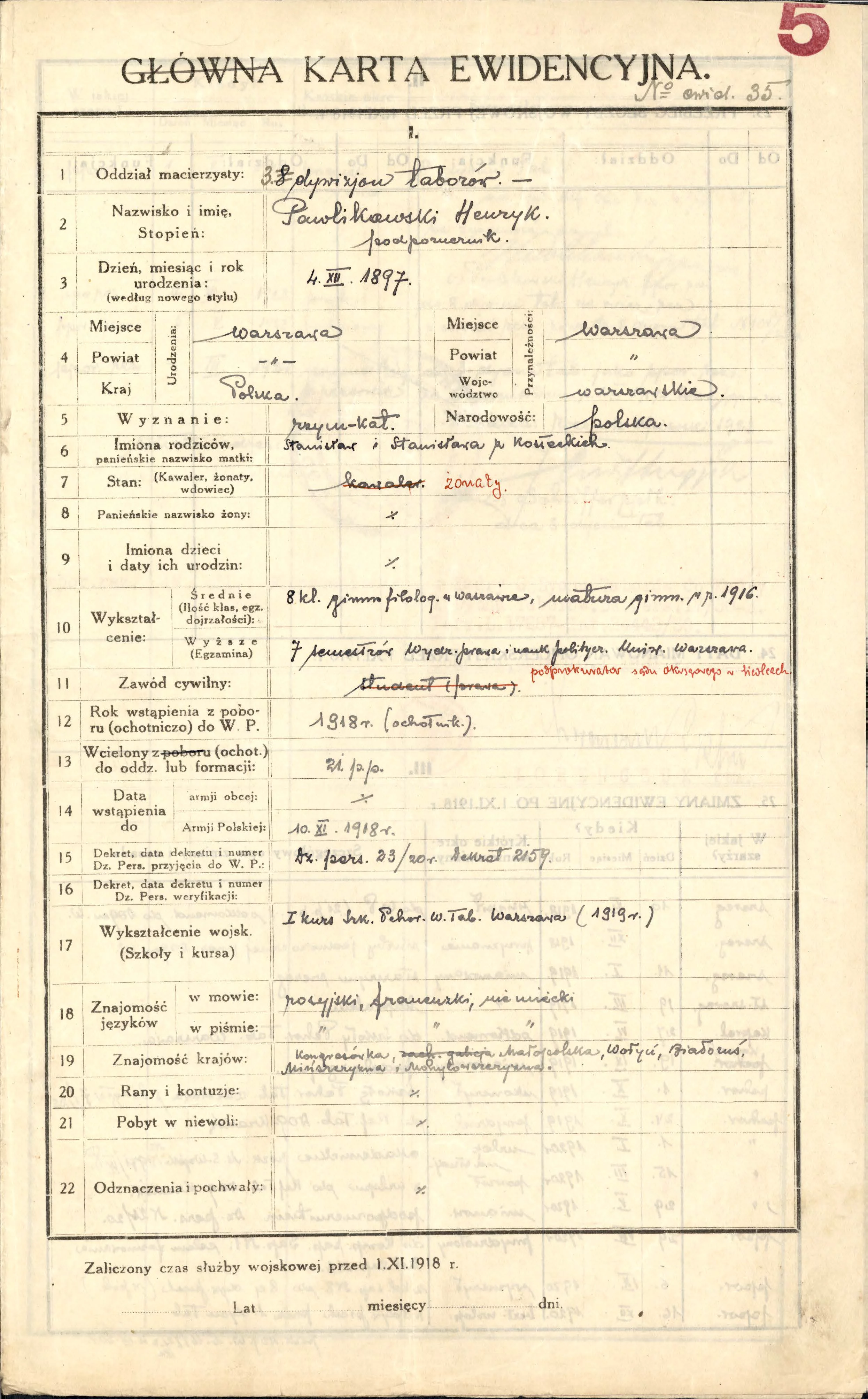 Ppor. rez. Henryk Dariusz PAWLIKOWSKI, syn Stanisława i Stanisławy z Kosteckich, urodził się 4 grudnia 1897 r. w Warszawie. Żonaty z Kazimierą