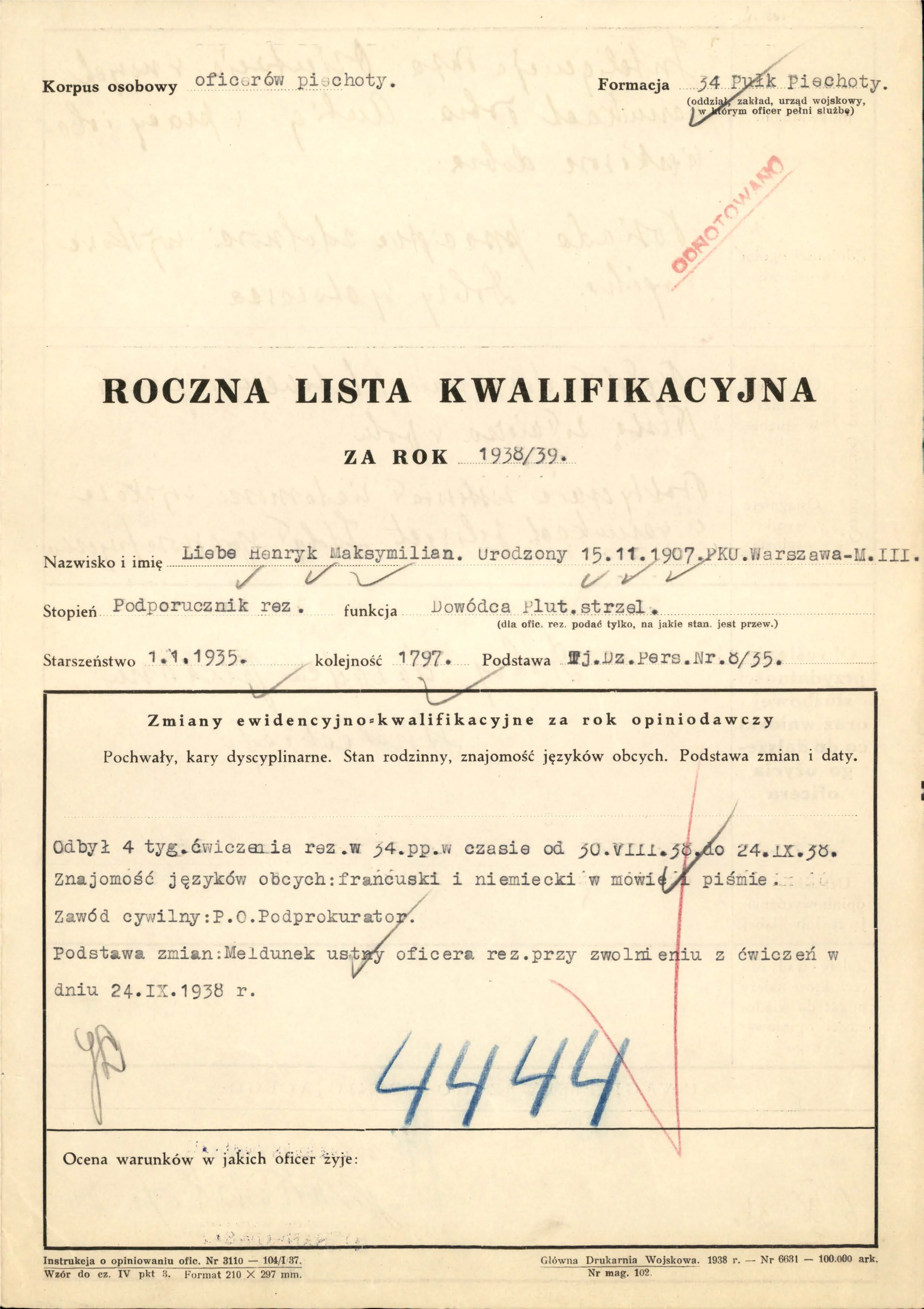 Ppor. rez. Henryk Maksymilian LIEBE, syn Maksymiliana i Wandy ze Schmalzów, urodził się 15 listopada 1907 r. w Warszawie. Był absolwentem Wydziału Prawa Uniwersytetu Warszawskiego. Następnie został mianowany prokuratorem w Warszawie. W latach 1930-1931 przeszedł przeszkolenie wojskowe w SPRPiech. w Zambrowie.