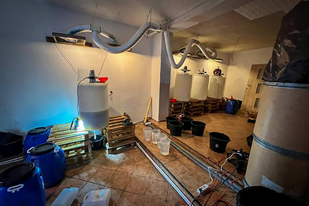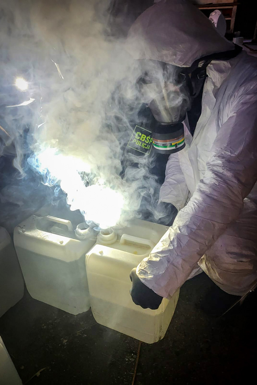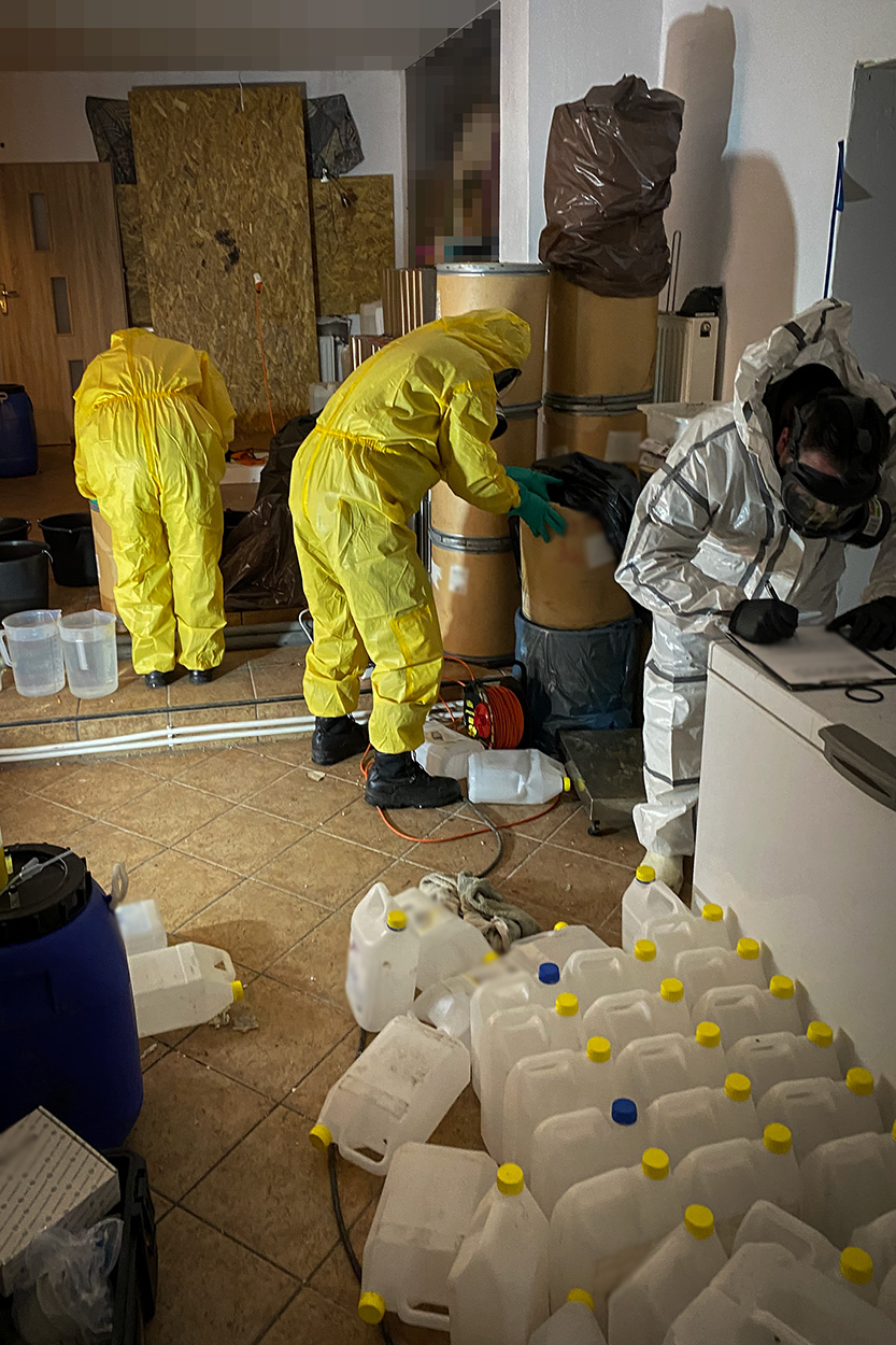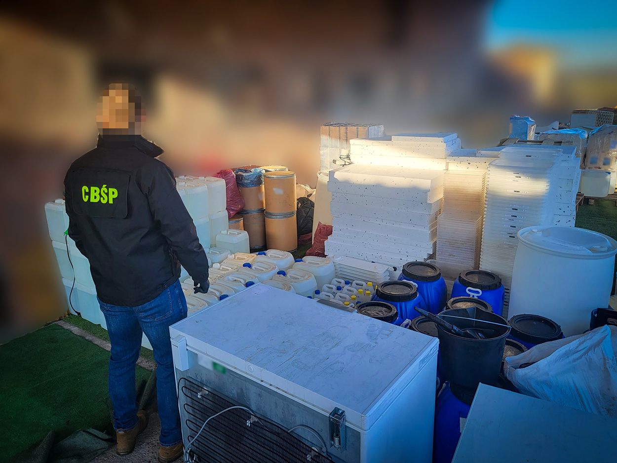 Z dotychczasowych ustaleń postępowania wynika, że w laboratorium produkowano substancję psychotropową w postaci 4-CMC (klefedron). W wyniku przeprowadzonych działań zabezpieczano ponad 100 litrów wytworzonego narkotyku, o czarnorynkowej wartości ok. 3 milionów złotych. Ponadto na miejscu ujawniono prawie 5 ton różnego rodzaju substancji chemicznych niezbędnych do produkcji narkotyków, w tym prekursory narkotykowe przechowywane w kanistrach, a także maski pełnotwarzowe, urządzenia do ważenia i porcjowania gotowego narkotyku.