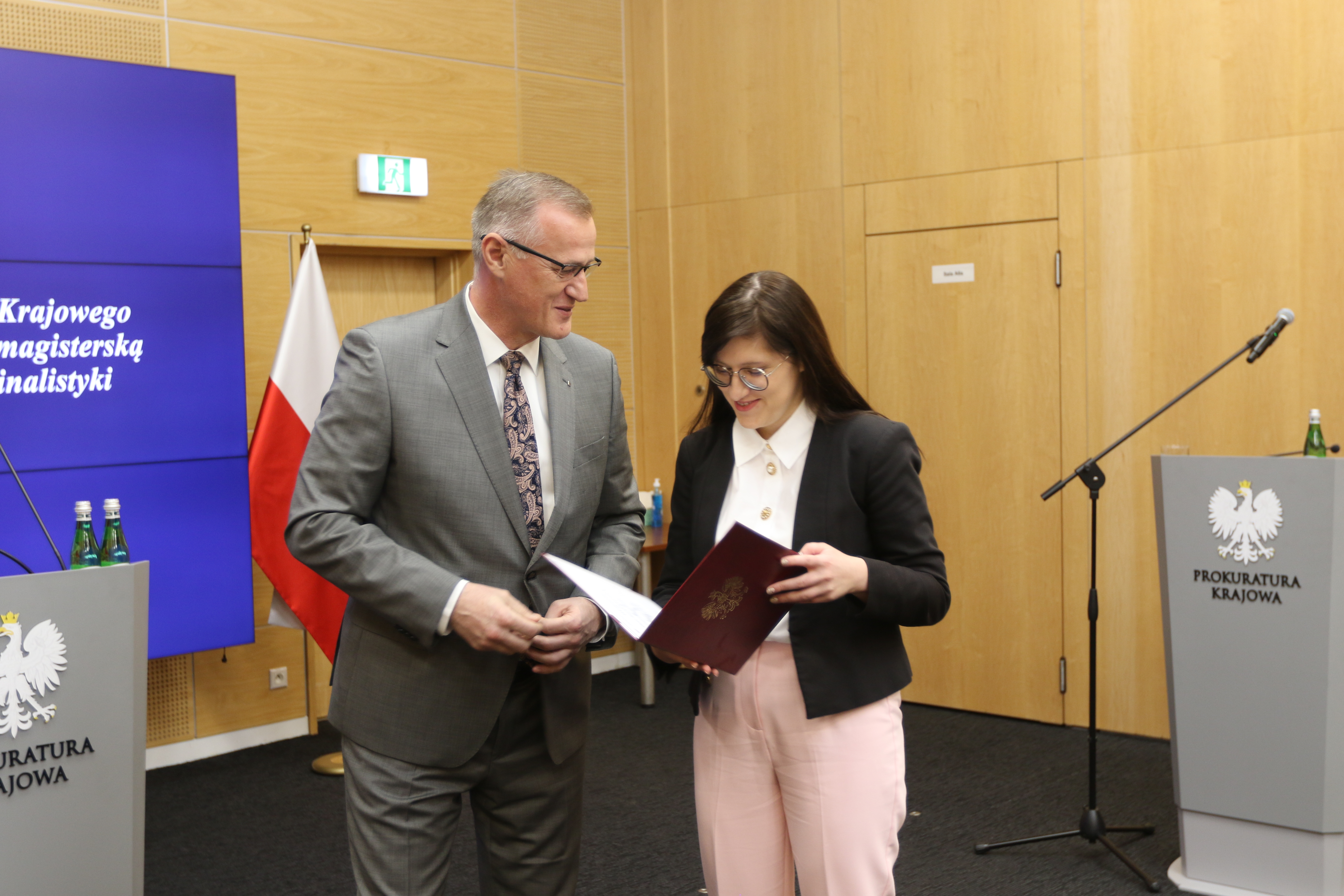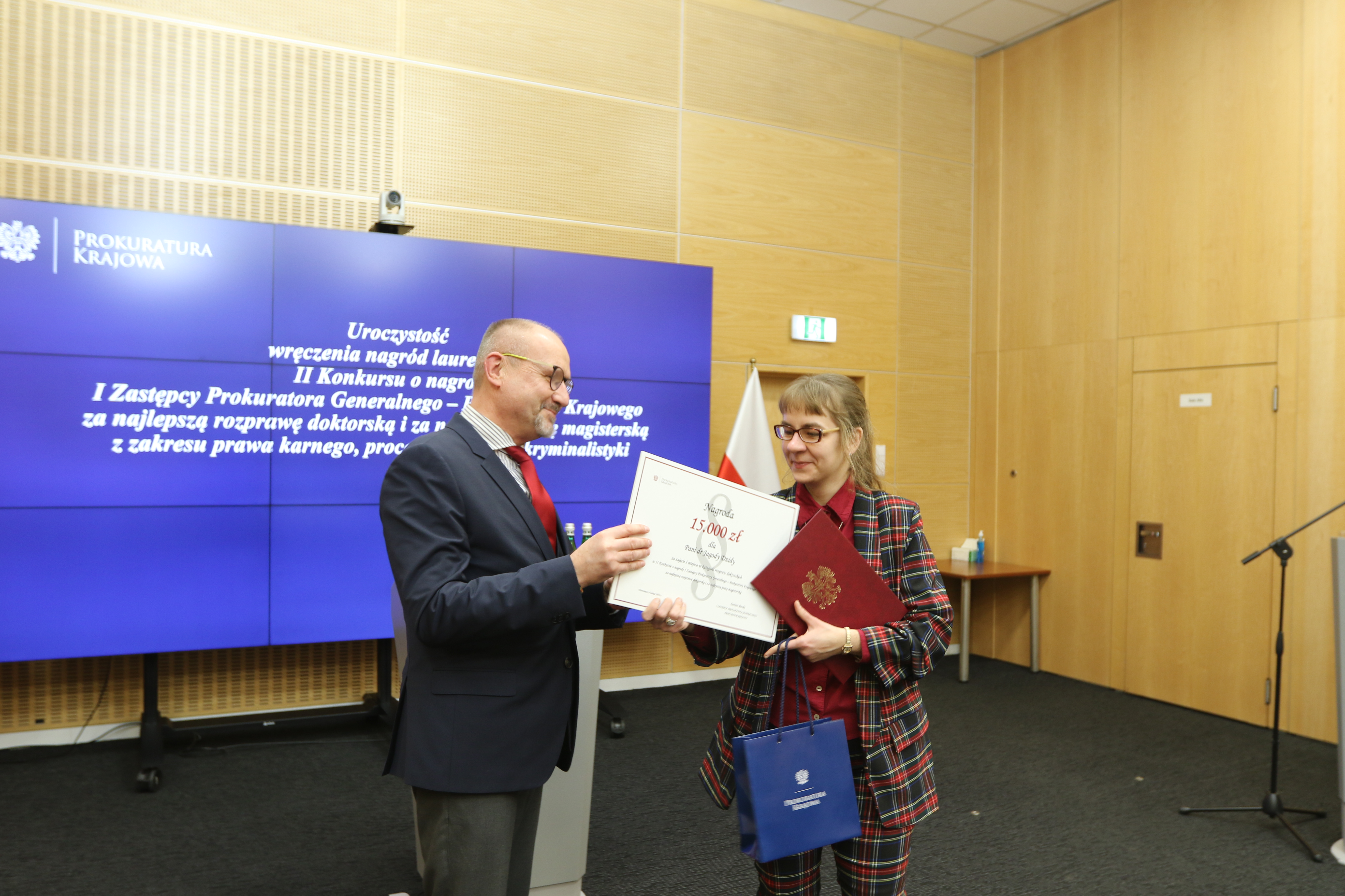 Nagrodę w wysokości 15.000 zł za najlepszą rozprawę doktorską otrzymała z rąk I Zastępcy Prokuratora Generalnego - Prokuratora Krajowego Pana Dariusza Barskiego, Pani dr Jagoda Dzida, która dysertację pt. „Klasyfikowanie pisma ręcznego według jego typu” napisała w Laboratorium Kryminalistyki na Wydziale Prawa i Administracji Uniwersytetu im. Adama Mickiewicza w Poznaniu pod kierunkiem naukowym dra hab. Szymona Matuszewskiego, prof. UAM.