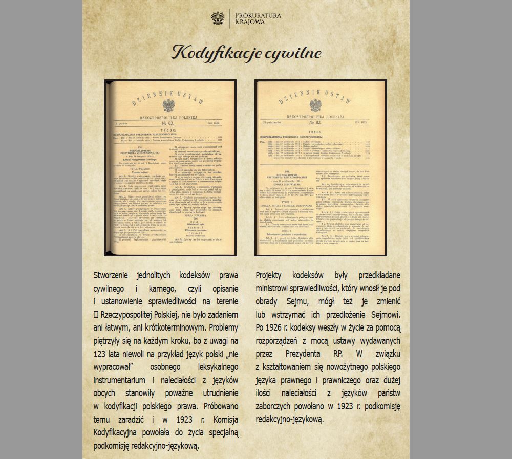 Odzyskanie przez Rzeczpospolitą Polską niepodległości w 1918 r. było dla naszego narodu wydarzeniem niezwykle ważnym i radosnym. Niepodległość Ojczyzny – realizacja marzeń i dążeń wielu pokoleń Polaków – stała się jednocześnie niezwykłym wyzwaniem o złożonym charakterze. Kluczowym elementem budowy sprawnego organizacyjnie państwa była unifikacja systemów prawnych obowiązujących na obszarze odrodzonej Rzeczypospolitej Polskiej oraz stworzenie jednolitego porządku prawnego i wymiaru sprawiedliwości. W 1918 r. obowiązywało na terenie Polski pięć porządków prawnych: prawo niemieckie (pruskie), prawo austriackie (galicyjskie), prawo rosyjskie, prawo byłego Królestwa Polskiego oraz prawo węgierskie.