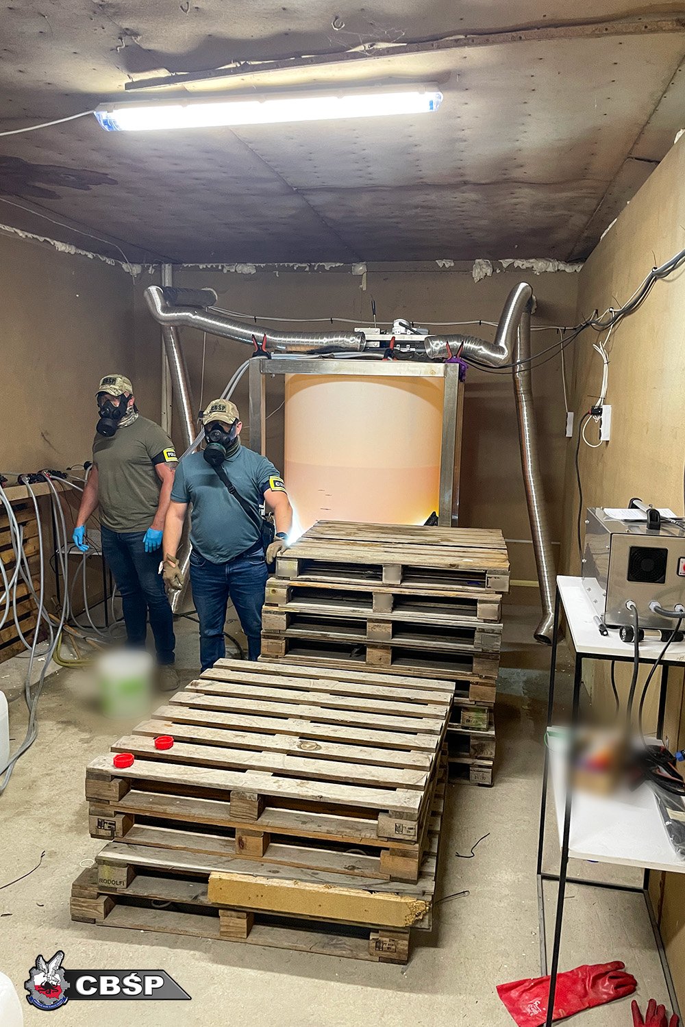 Na miejscu ujawniono i zabezpieczono specjalistyczną aparaturę, urządzenia oraz kompletną linię technologiczną służącą do produkcji narkotyków. Zatrzymano także dwie osoby nadzorujące proces produkcji narkotyków.