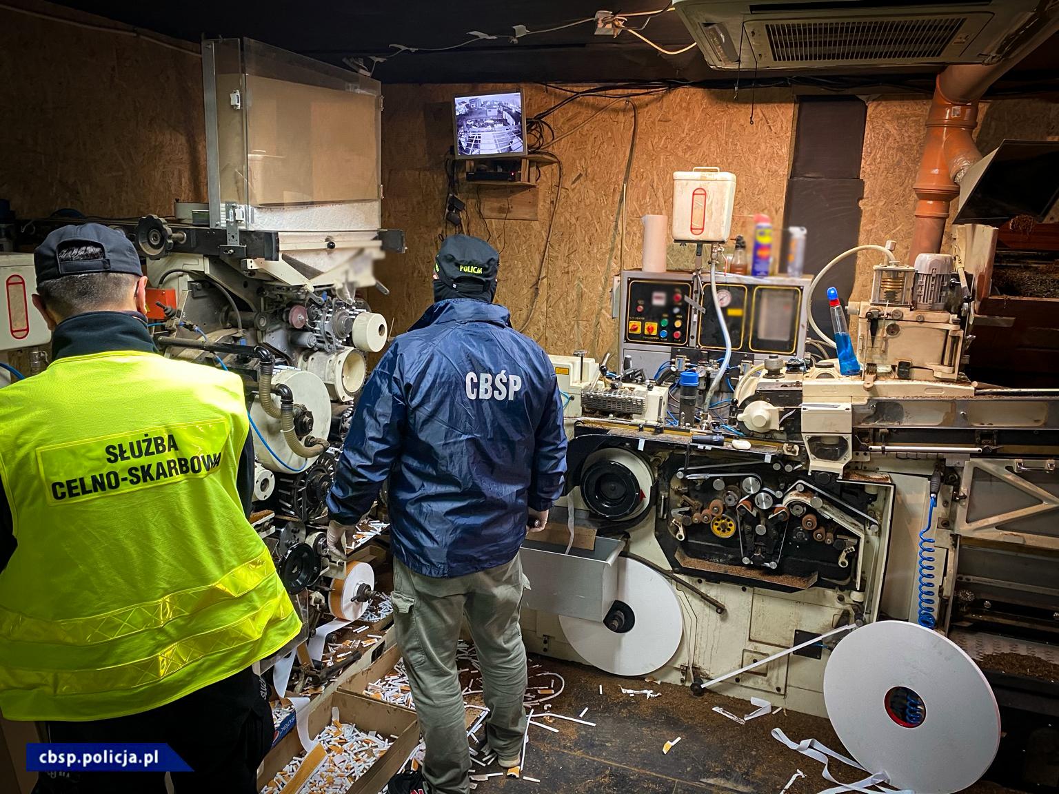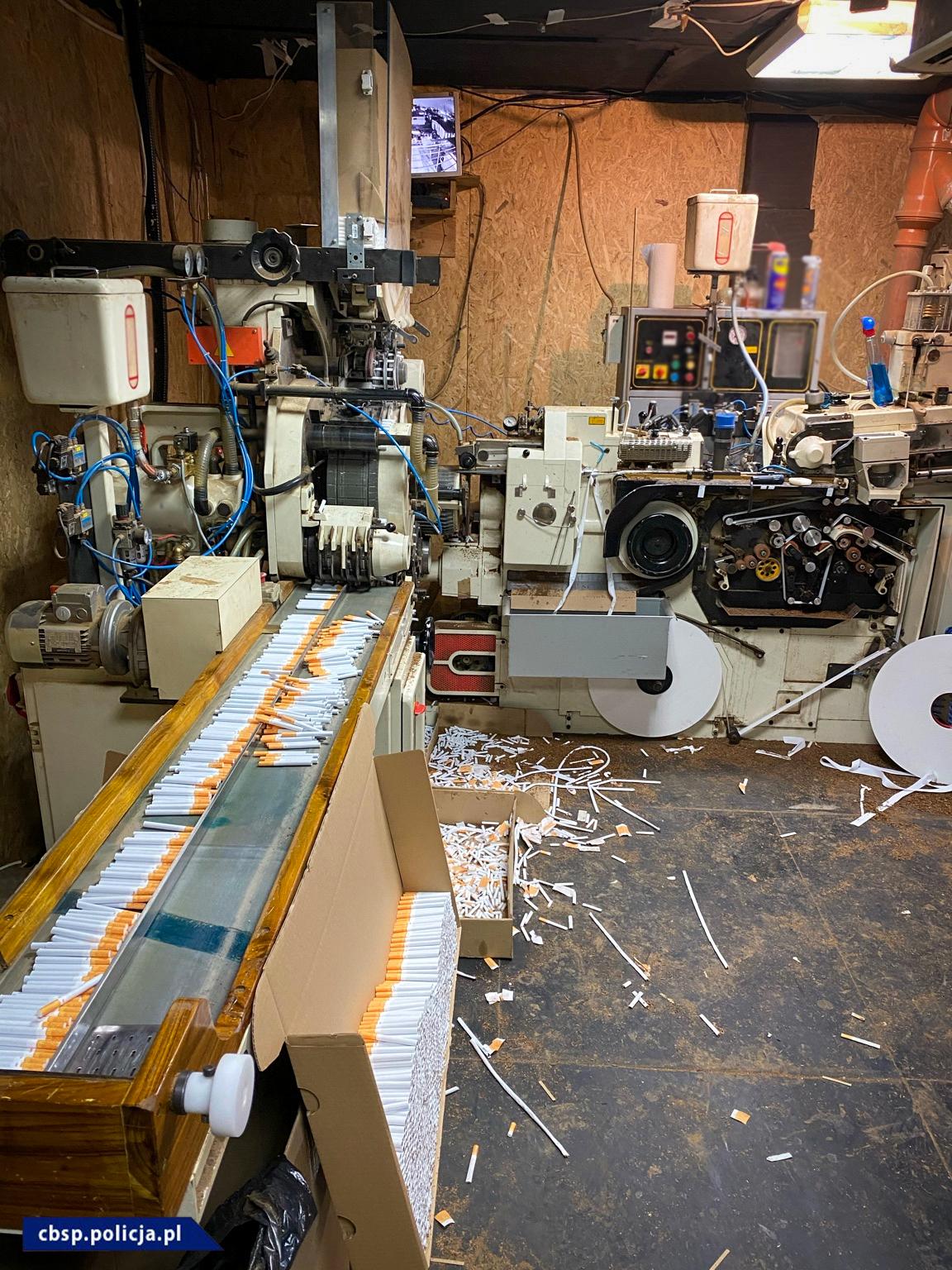 Funkcjonariusze CBŚP i KAS zabezpieczyli specjalistyczną maszynę produkcyjną oraz przejęli około 400 tys. gotowych papierosów, komponenty służące do ich wytwarzania, m.in. blisko 1 300 kg krajanki tytoniowej, a także półprodukty niezbędne w procesie produkcyjnym oraz okleiny filtra z podrobionym znakiem amerykańskiego koncernu tytoniowego.