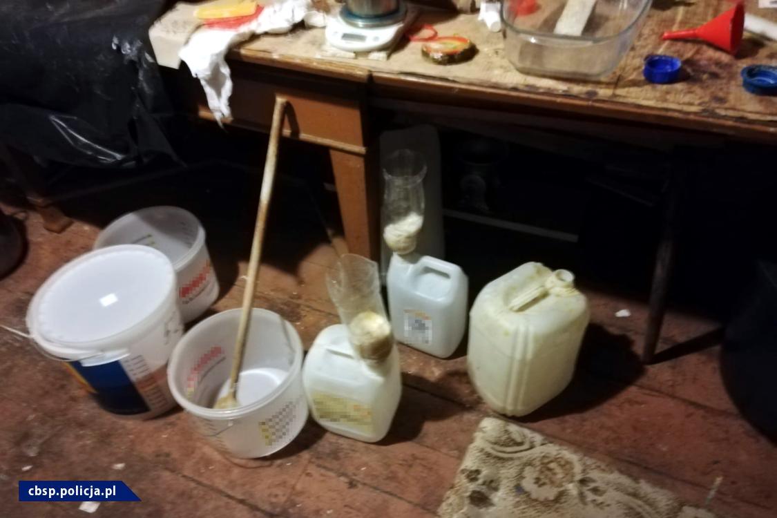 W trakcie przeszukania domu policjanci potwierdzili swoje przypuszczenia. Na pierwszym piętrze odkryli laboratorium metamfetaminy. Na miejscu przeprowadzono bardzo dokładne oględziny pomieszczenia, w którym znajdowało się laboratorium. Policjanci znaleźli i zabezpieczyli odczynniki oraz substancje chemiczne, łącznie blisko 93 litry różnych chemikaliów służących do produkcji tego narkotyku.