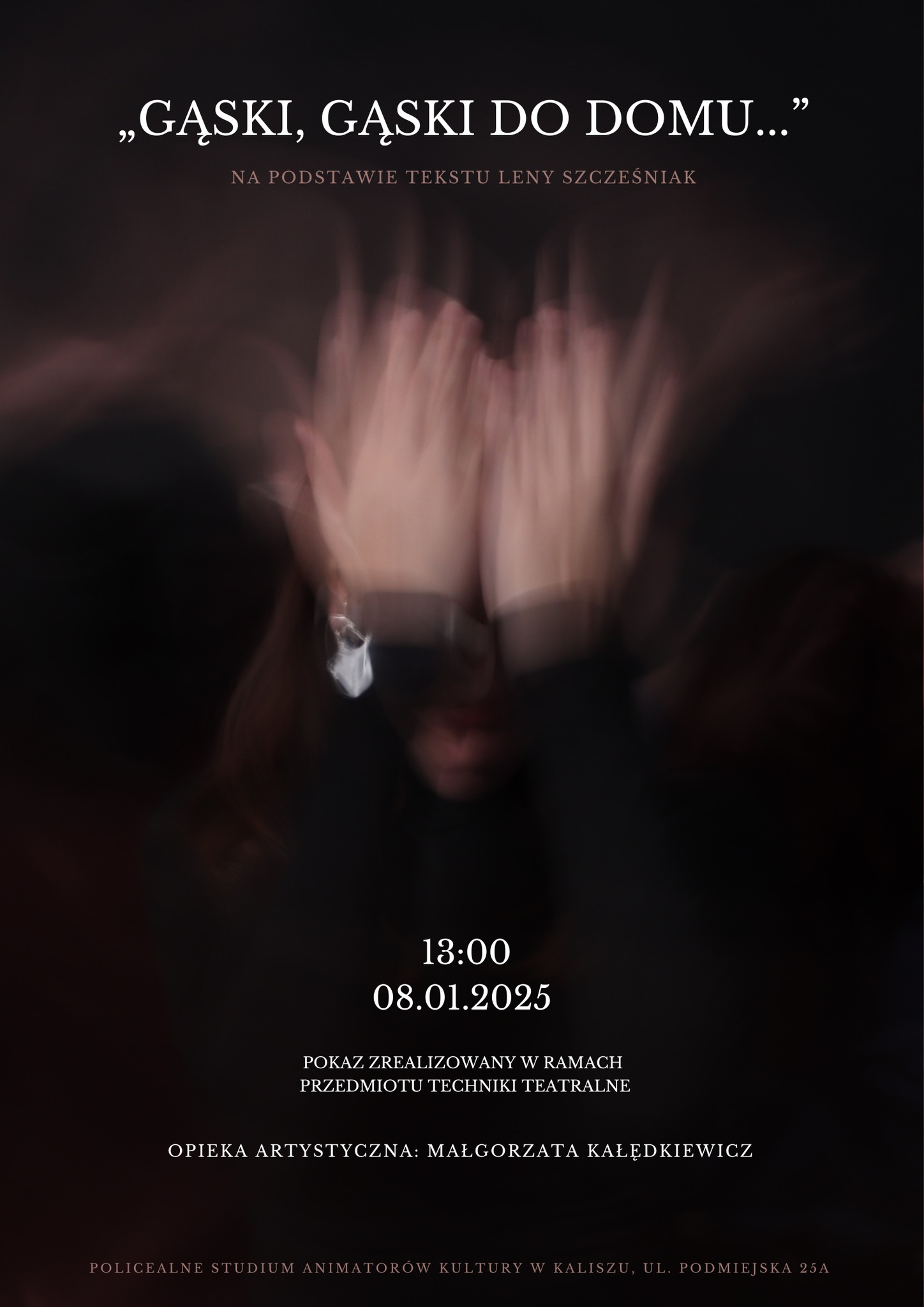 8 stycznia II rok teatru dziennego zaprezentował na scenie Studium Animatorów Kultury w Kaliszu egzamin z Technik teatralnych „Gąski, gąski do domu”. Wykładowczyni przedmiotu Małgorzata Kałędkiewicz zaproponowała w tym semestrze pracę nad bardzo ciekawym tekstem, bo napisanym przez młoda osobę – Lenę Szcześniak. Spektakl odnosi się do bardzo istotnego problemu – toksycznej komunikacji i tego, jakie spustoszenie potrafi czynić w naszym życiu.