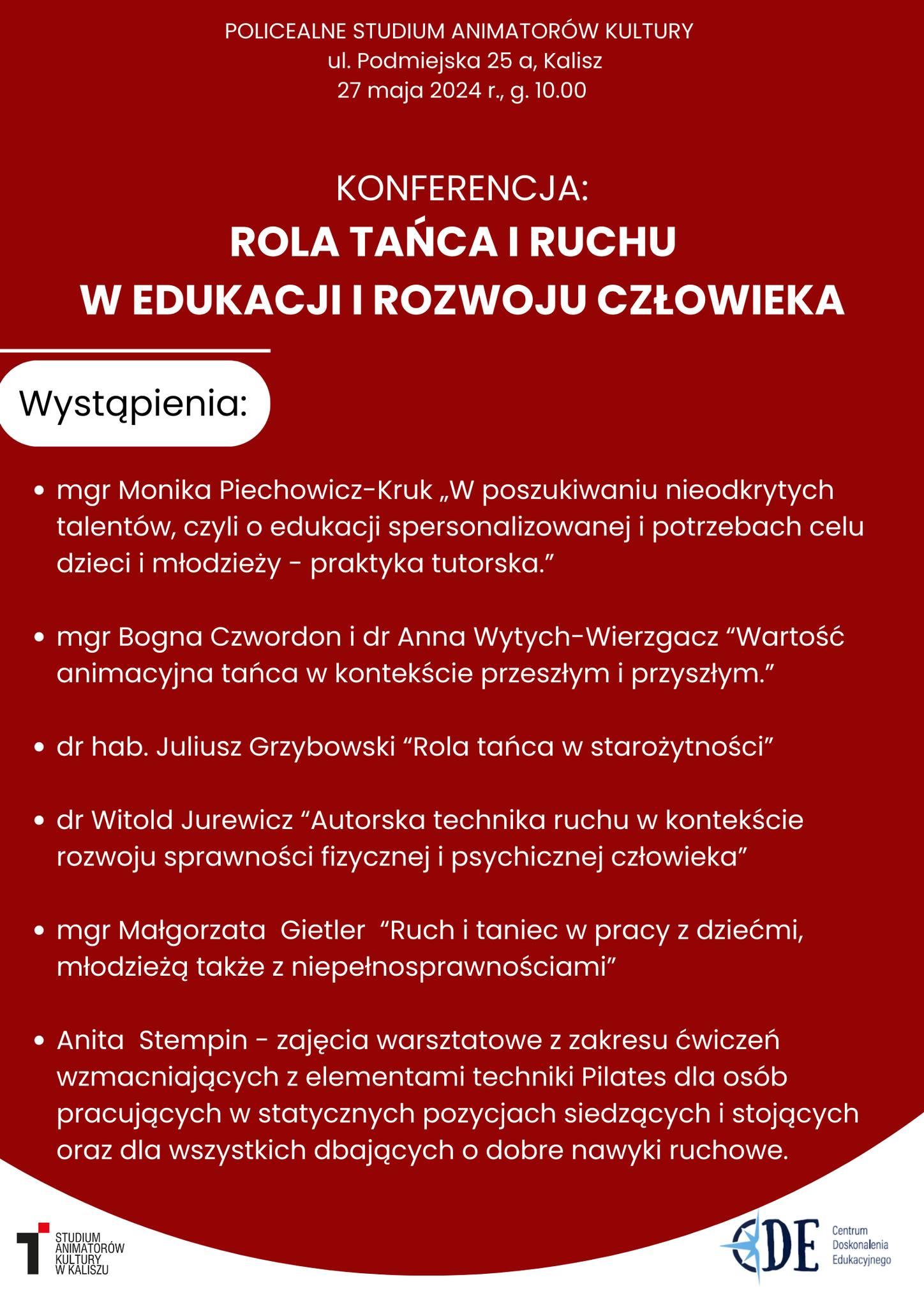 Zapraszamy 27 maja o godzinie 10:00 na konferencję pt. "Rola tańca i ruchu w edukacji i rozwoju człowieka". To wydarzenie organizowane z myślą o dyrektorach szkół podstawowych i ponadpodstawowych, nauczycielach przedmiotów związanych z ruchem i/lub muzyką oraz doradców zawodowych. Konferencję współorganizujemy z Centrum Doskonalenia Edukacyjnego.
