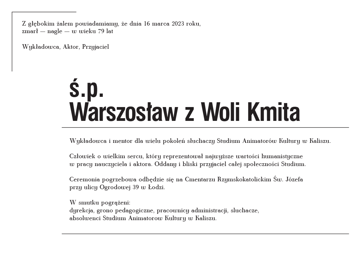 To informacja, w którą nie możemy jeszcze uwierzyć. Dziś w nocy zmarł Warszosław Kmita - wykładowca Studium Animatorów Kultury w Kaliszu. Wspominają Go dyrektor naszej szkoły Bogna Czwordon oraz Michał Trusz.
