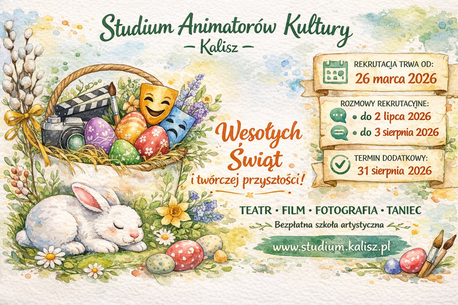 Niech te Święta Wielkanocne będą jak dobrze ułożony koszyczek — pełne tego, co naprawdę ważne: spokoju, nadziei, bliskości i odrobiny radosnego zamieszania. Niech wiosna wniesie do codzienności świeżą energię, a świąteczny czas pozwoli zwolnić, złapać oddech i nacieszyć się tym, co proste i dobre. Smacznego jajka, lekkiego nastroju, wielu powodów do uśmiechu i samych dobrych chwil przy wielkanocnym stole. Wesołych Świąt Wielkanocnych od całego Studium Animatorów Kultury w Kaliszu - specjalnie dla Was.