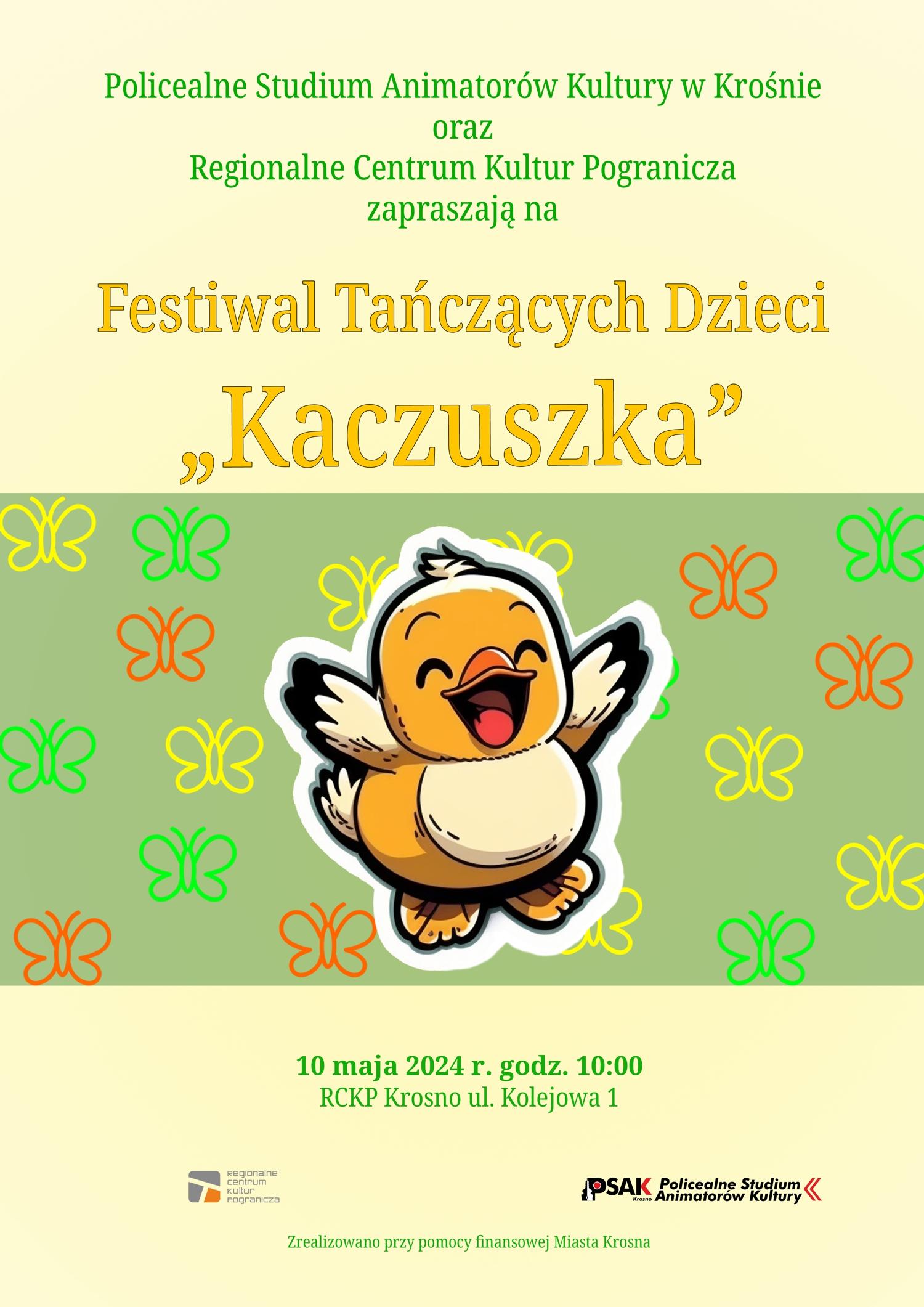 Po raz pierwszy mamy wielką przyjemność zaprosić wszystkich miłośników tańca i zabawy na Festiwal Tańczących Dzieci „Kaczuszka”, który odbędzie się 10 maja 2024 r. o godz. 10.00 w Regionalnym Centrum Kultur Pogranicza w Krośnie.