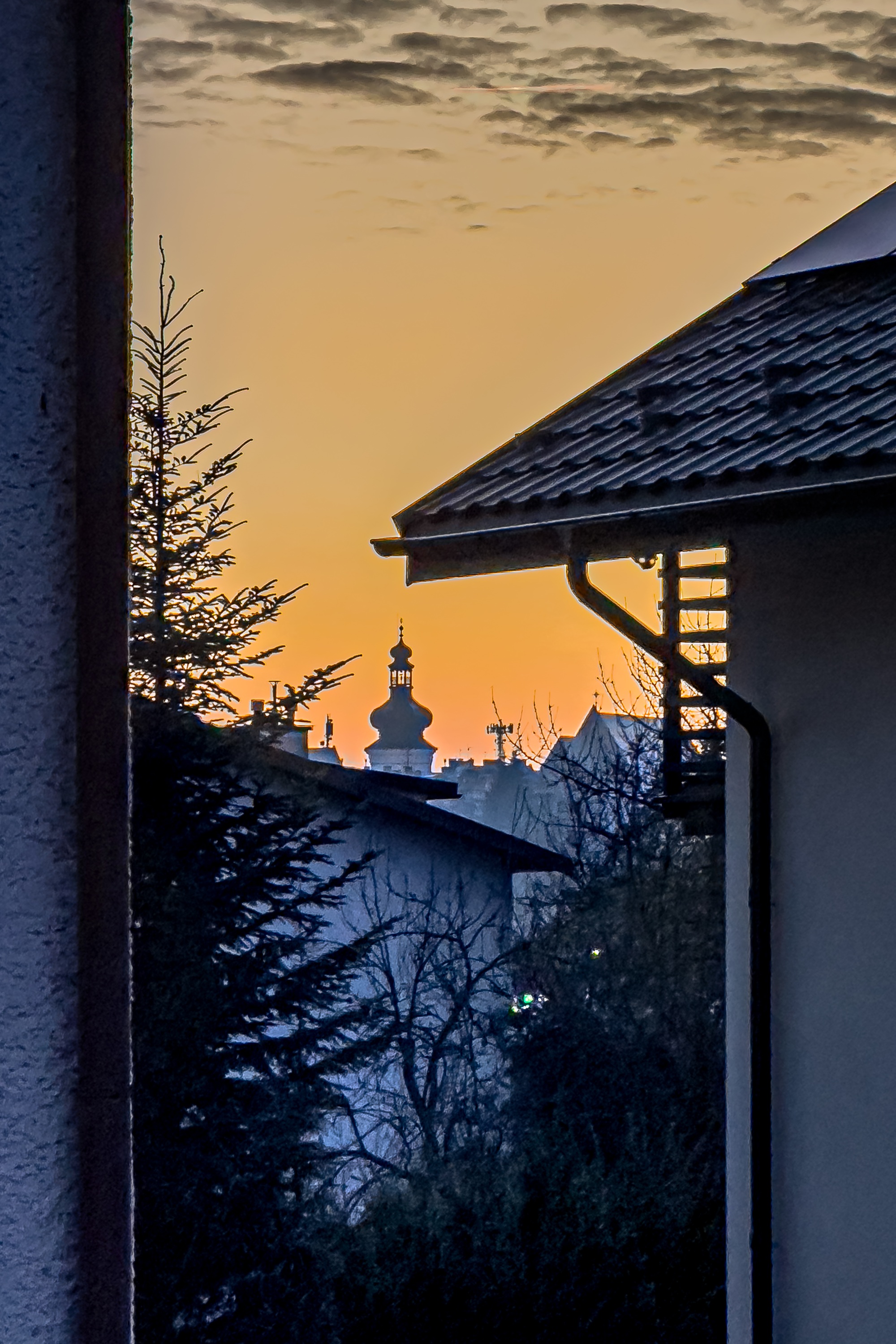 "Zachód słońca w Krośnie ukazany w kadrowaniu szczelinowym: pomiędzy bryłami współczesnej zabudowy wyłania się wieża Kościoła Farnego. Ciepła, złoto-bursztynowa gradacja nieba kontrastuje z chłodnymi, niemal graficznymi formami dachów i drzew w półcieniu. Światło modeluje przestrzeń, prowadząc wzrok ku centralnemu punktowi kadru. Zdjęcie zrobione telefonem".