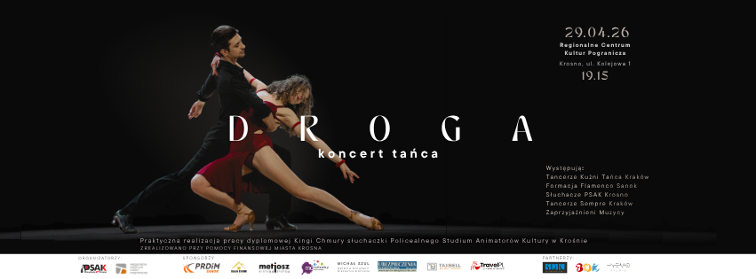 Koncert tańca “Droga” jest praktyczną realizacją pracy dyplomowej Kingi Chmury, słuchaczki Policealnego Studium Animatorów Kultury w Krośnie kształcącej się w zawodzie animator tańca. Wydarzenie odbędzie się 29 kwietnia 2026 r. o godz. 19.15 w Regionalnym Centrum Kultur Pogranicza w Krośnie.