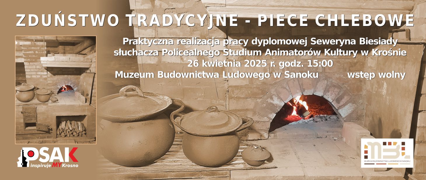 W dniu 26 kwietnia 2025 r. o godz. 15.00 w Muzeum Budownictwa Ludowego w Sanoku odbędzie się praktyczna realizacja pracy dyplomowej Seweryna Biesiady - słuchacza Policealnego Studium Animatorów Kultury w Krośnie kształcącego się w zawodzie animator kultury regionalnej. Tematem pracy jest „Zduństwo tradycyjne - piece chlebowe”.