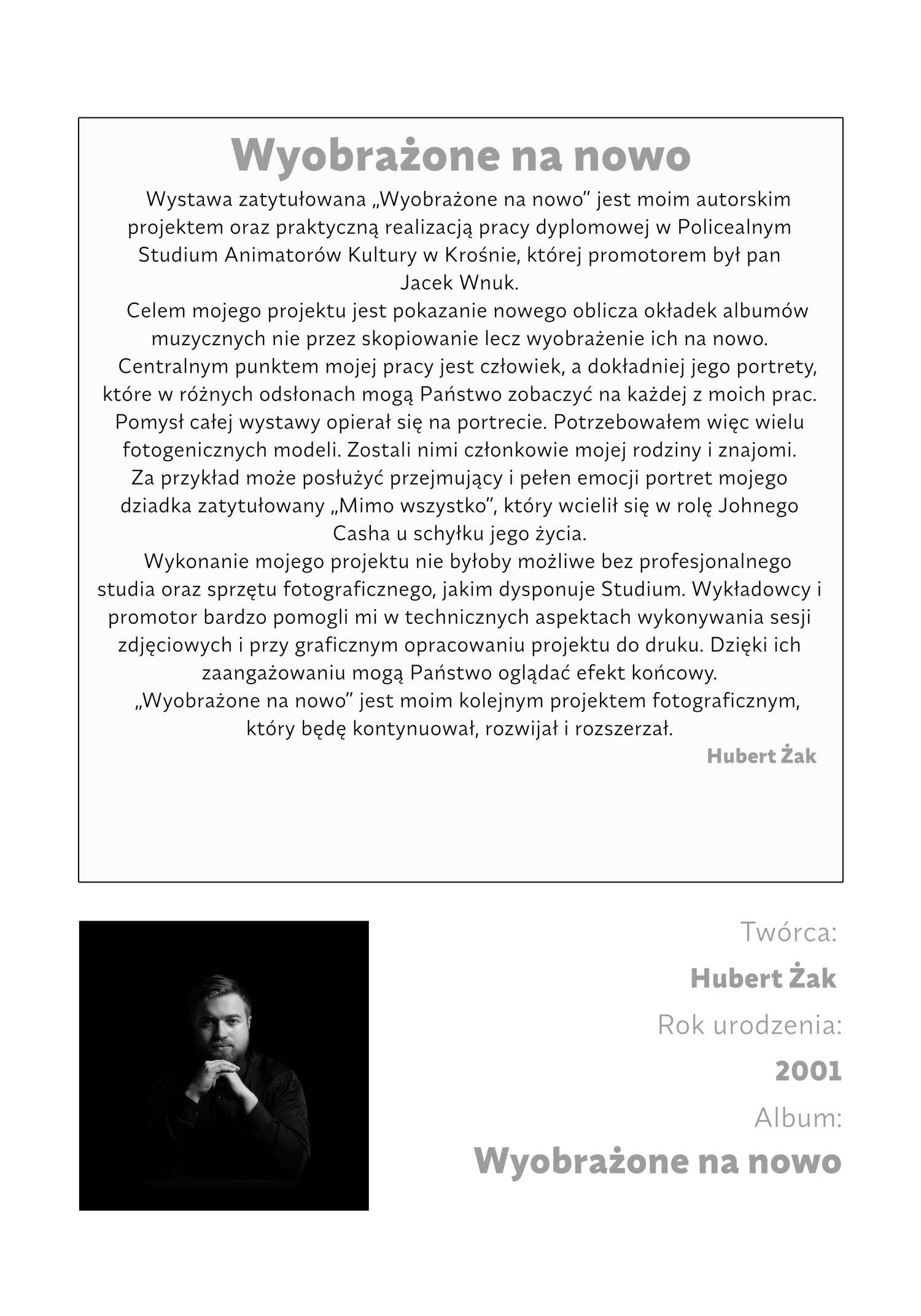 „Wyobrażone na nowo” to wystawa, której autorem jest Hubert Żak - tegoroczny absolwent Policealnego Studium Animatorów Kultury w Krośnie kierunku animator fotografii.
