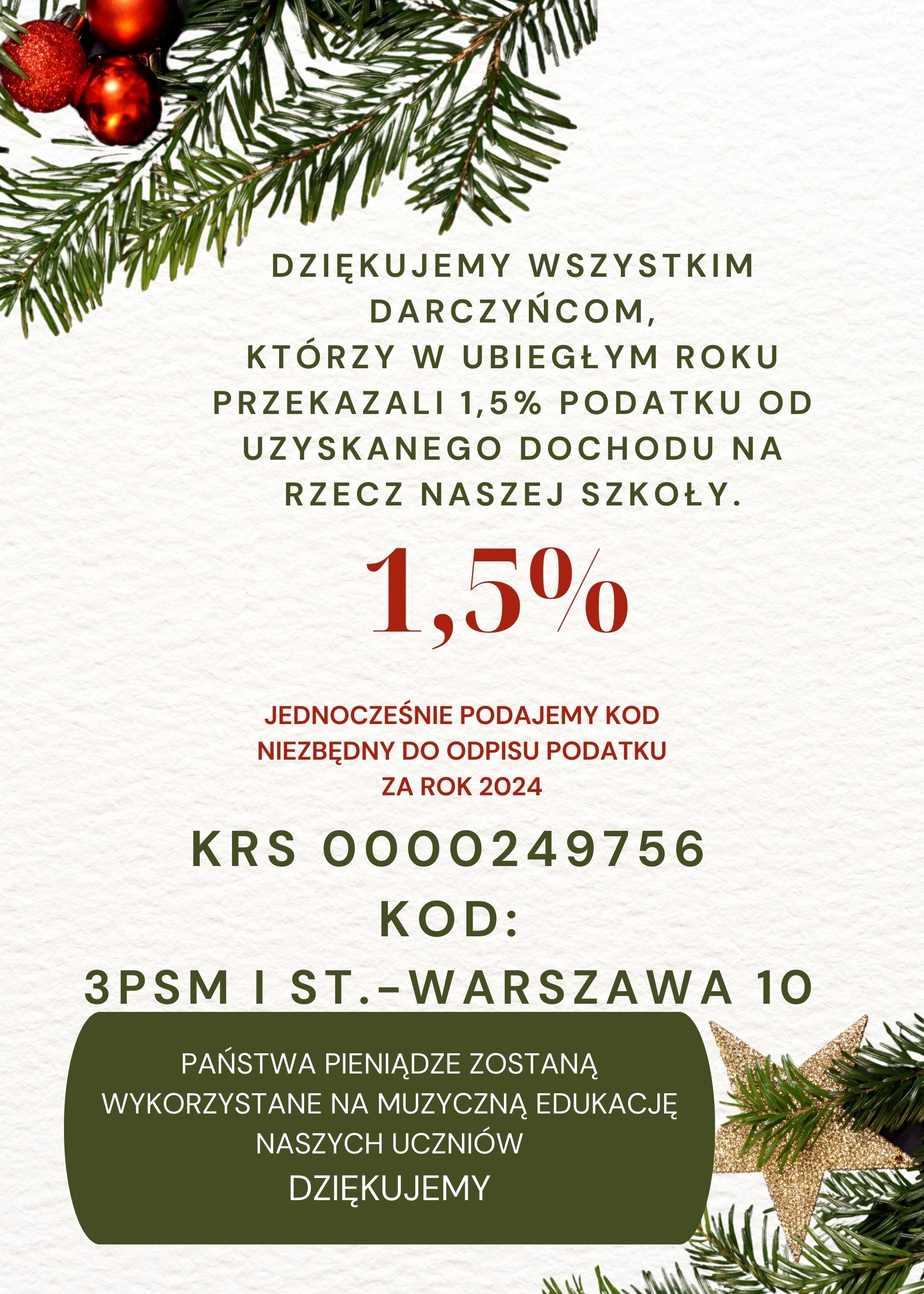 W tym roku 1,5 % podatku na rzecz naszej Szkoły przyjmuje Fundacja Harmonia im. Grażyny Bacewicz w Warszawie