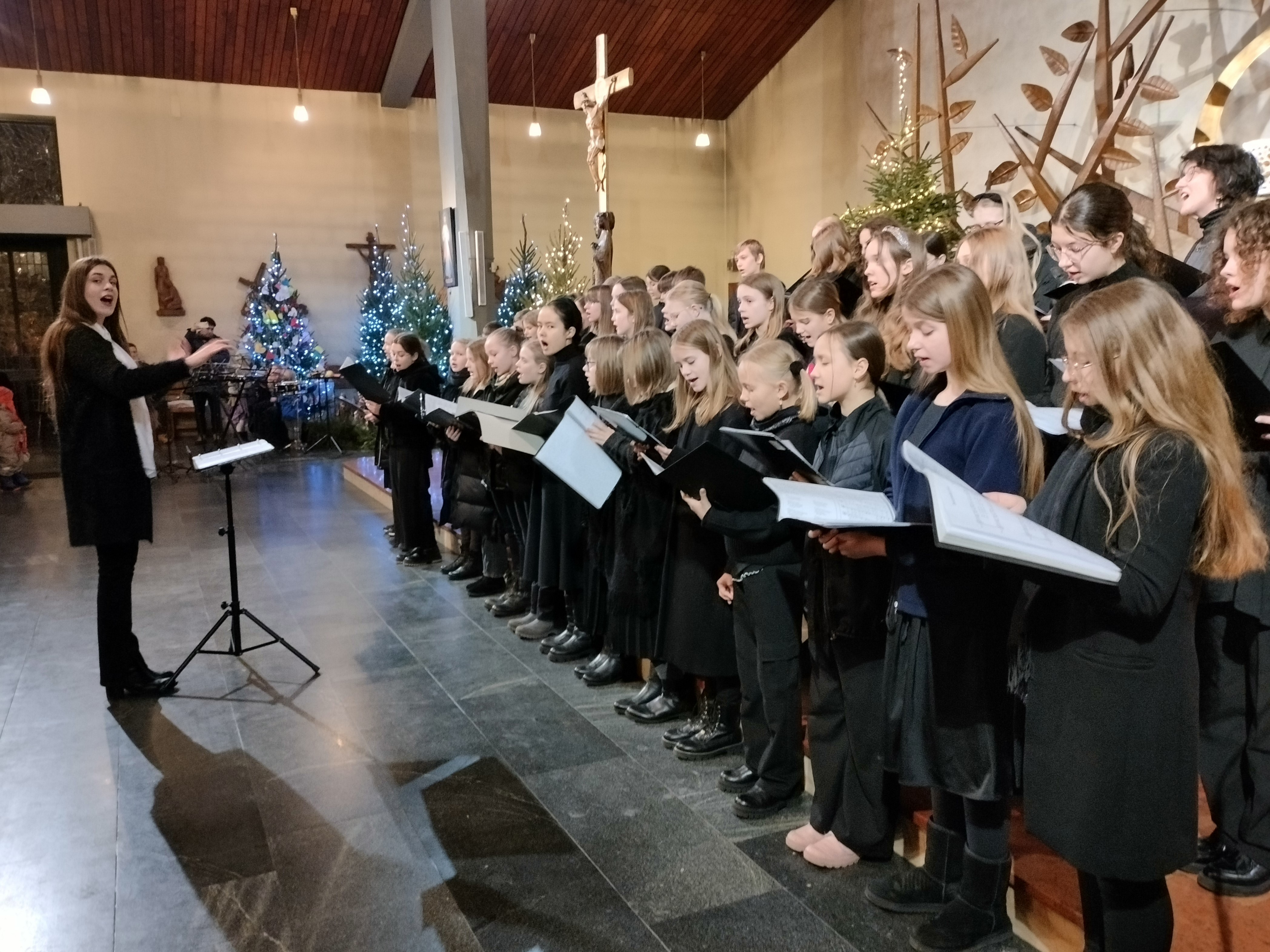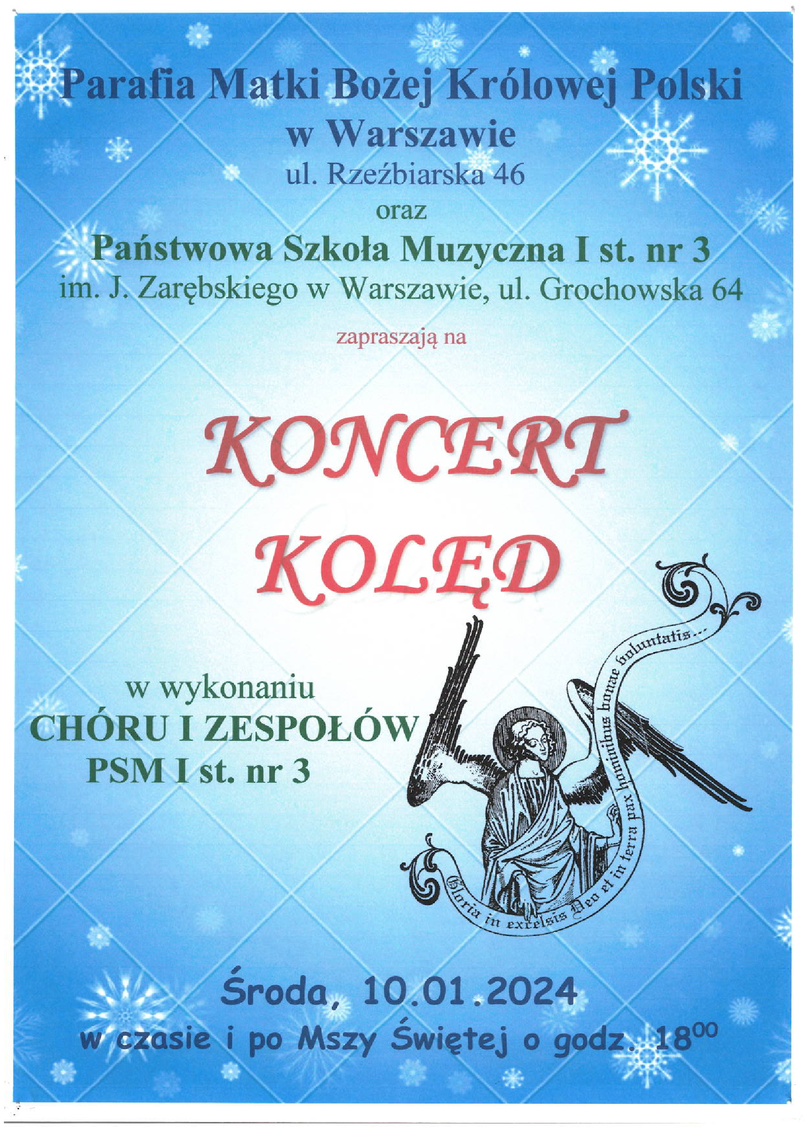Koncerty kolędowe mają w naszej szkole długoletnią tradycję. W tym roku doroczny Koncert Kolęd odbył się już po raz dwudziesty drugi. Zaśpiewaliśmy i zagraliśmy w kościele Matki Boskiej Królowej Polski w Warszawie. Zaprezentowały się zespoły: chór, orkiestra, dwa zespoły smyczkowe i zespół wokalny. Uczniowie, przygotowani przez p. Ewę Sobierę, p. Pawła Stępniewskiego, p. Emilię Jankowską i p. Annę Pawelec, zaprezentowali kolędy dawne i nowe, znane i mniej znane. Ponieważ kolędowanie to okazja do wspólnego muzykowania, wszyscy nauczyciele wystąpili ze swoimi uczniami, a na koniec koncertu cała widownia zaśpiewała z chórem i orkiestrą "Cichą noc" i "Bóg się rodzi". Koncert tradycyjnie zakończył się przyśpiewką kolędniczą "Za kolędę dziękujemy".