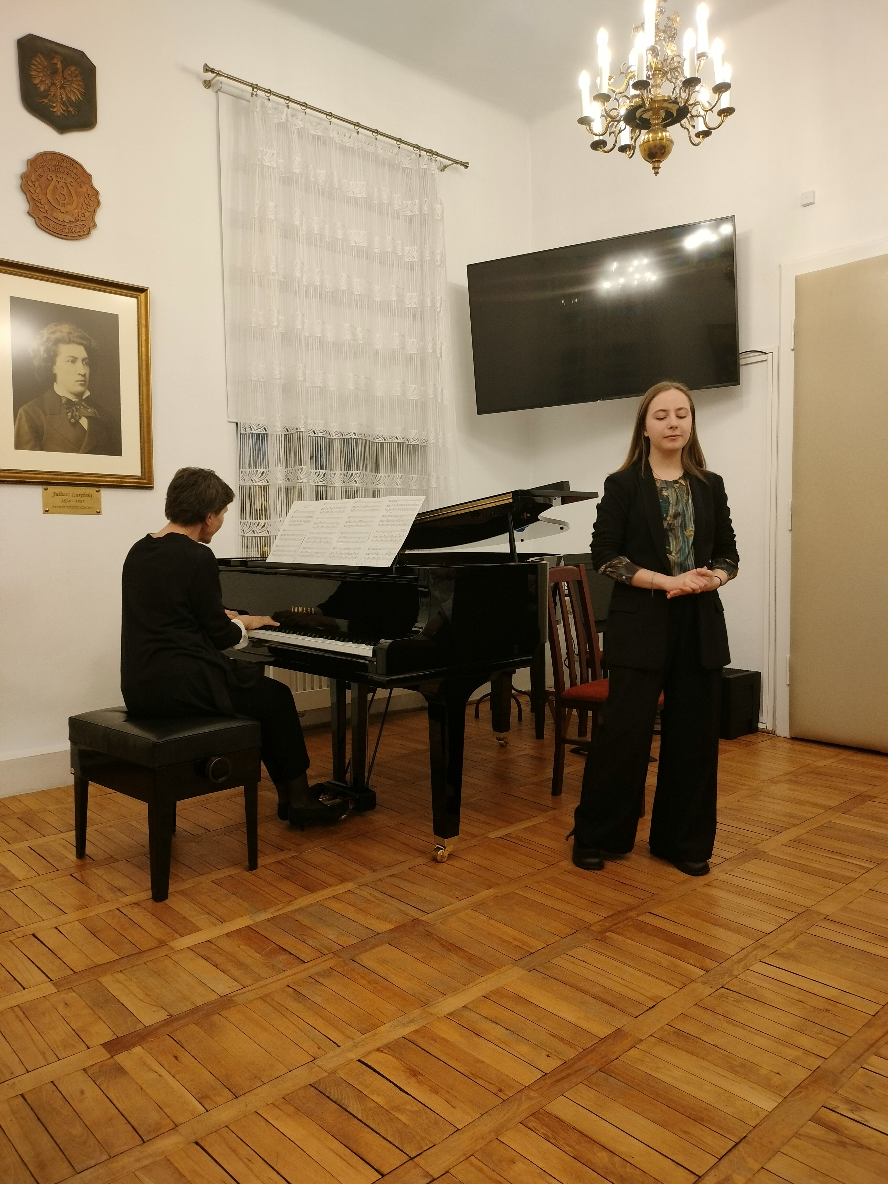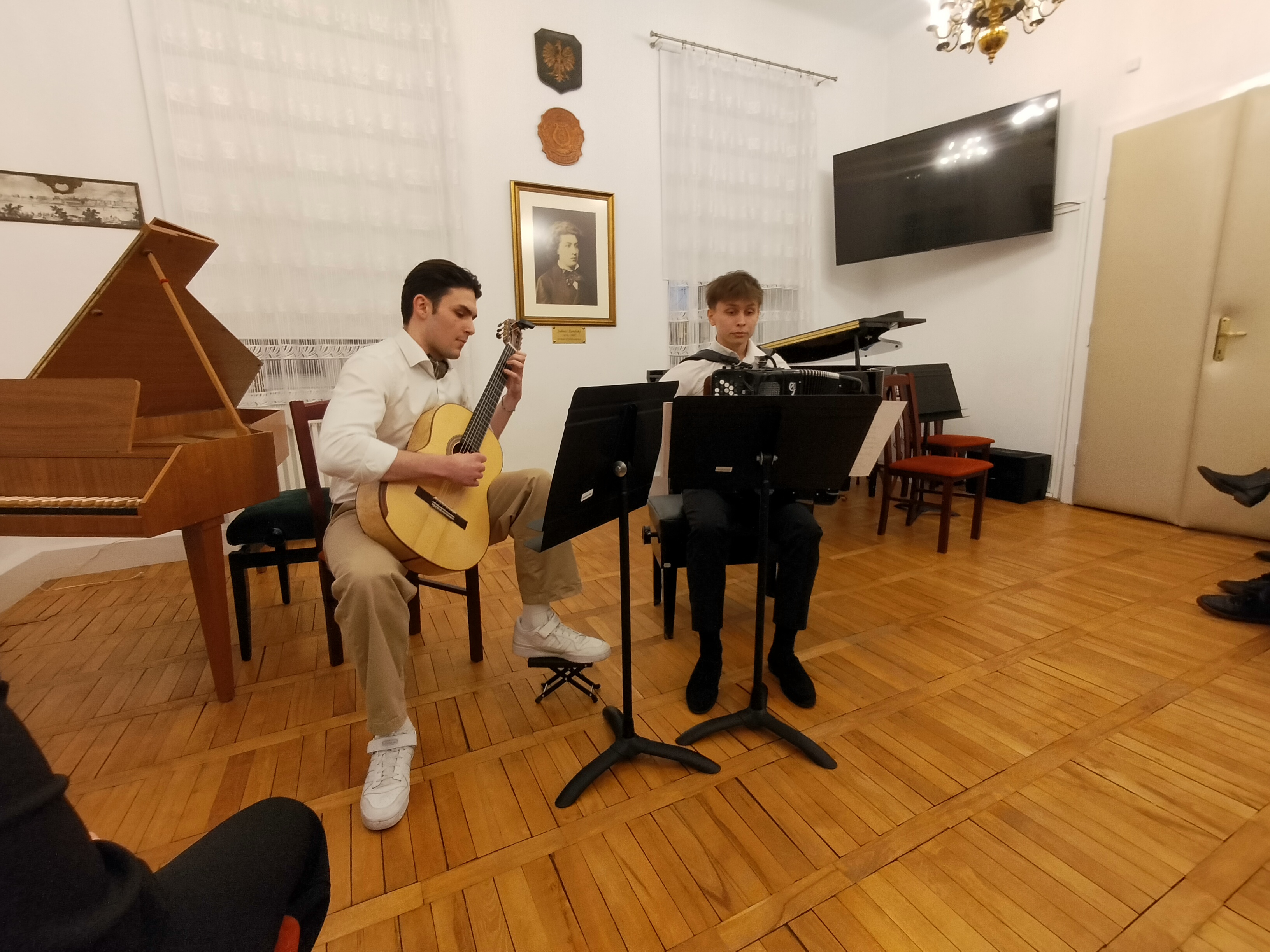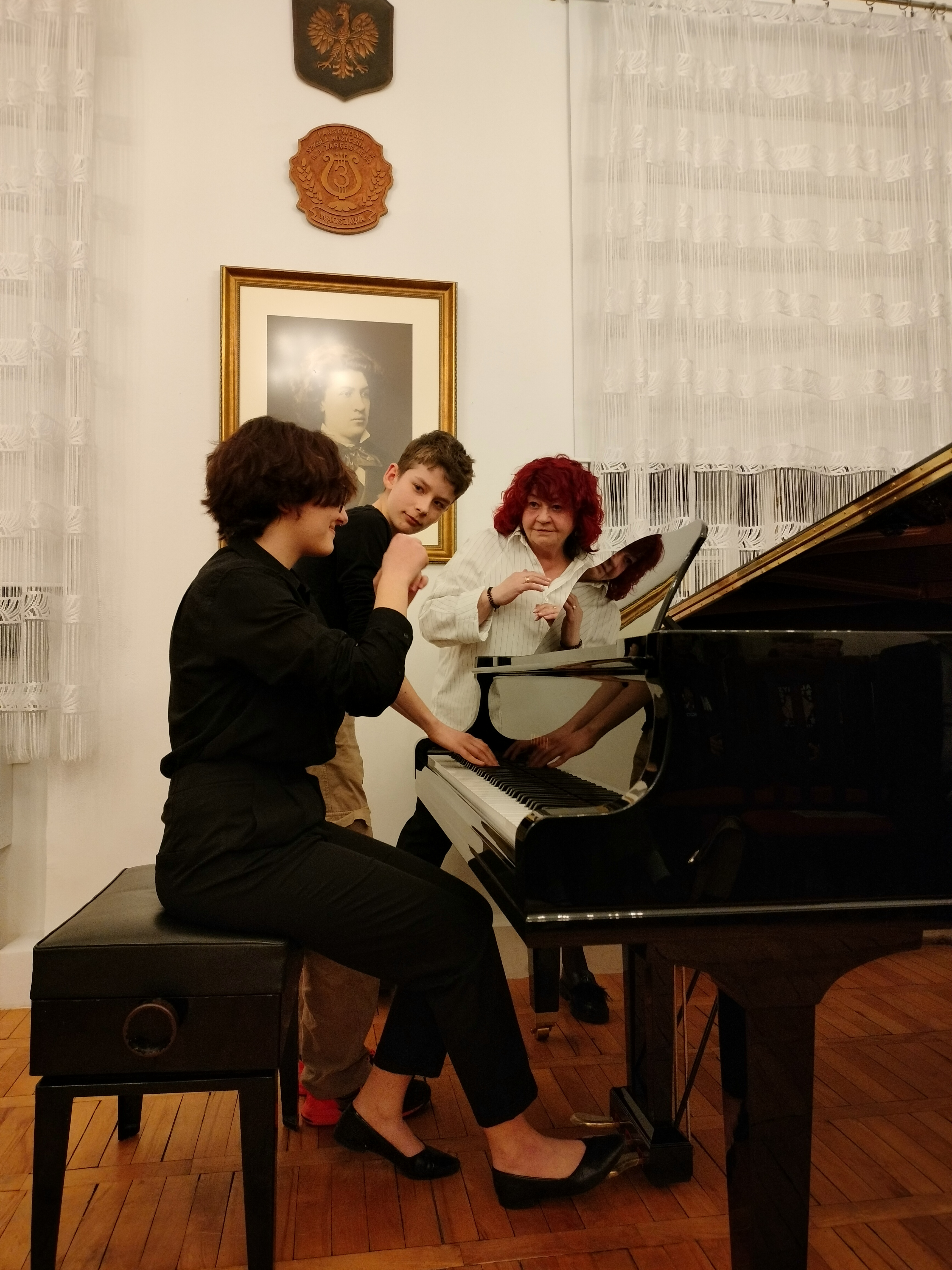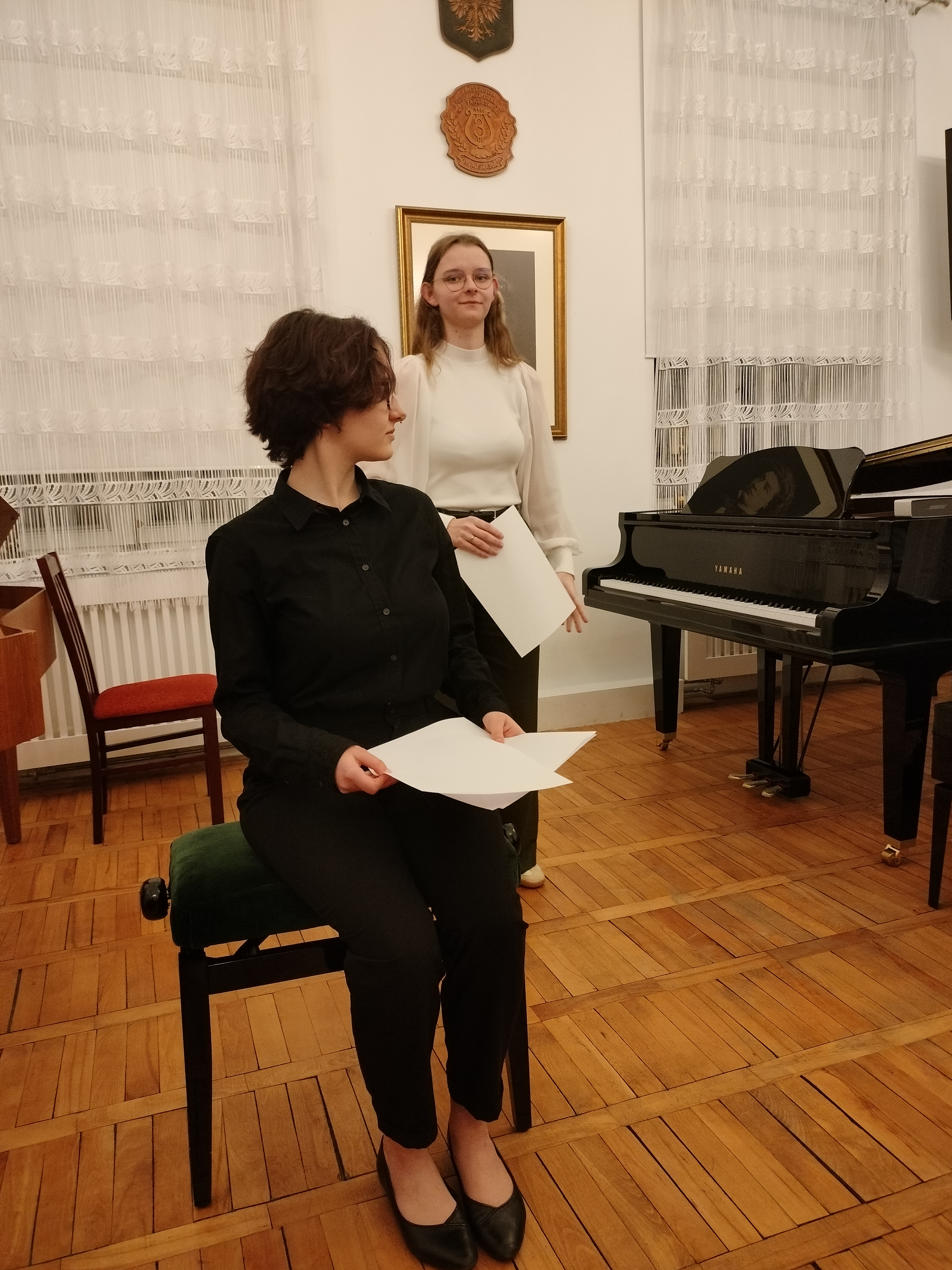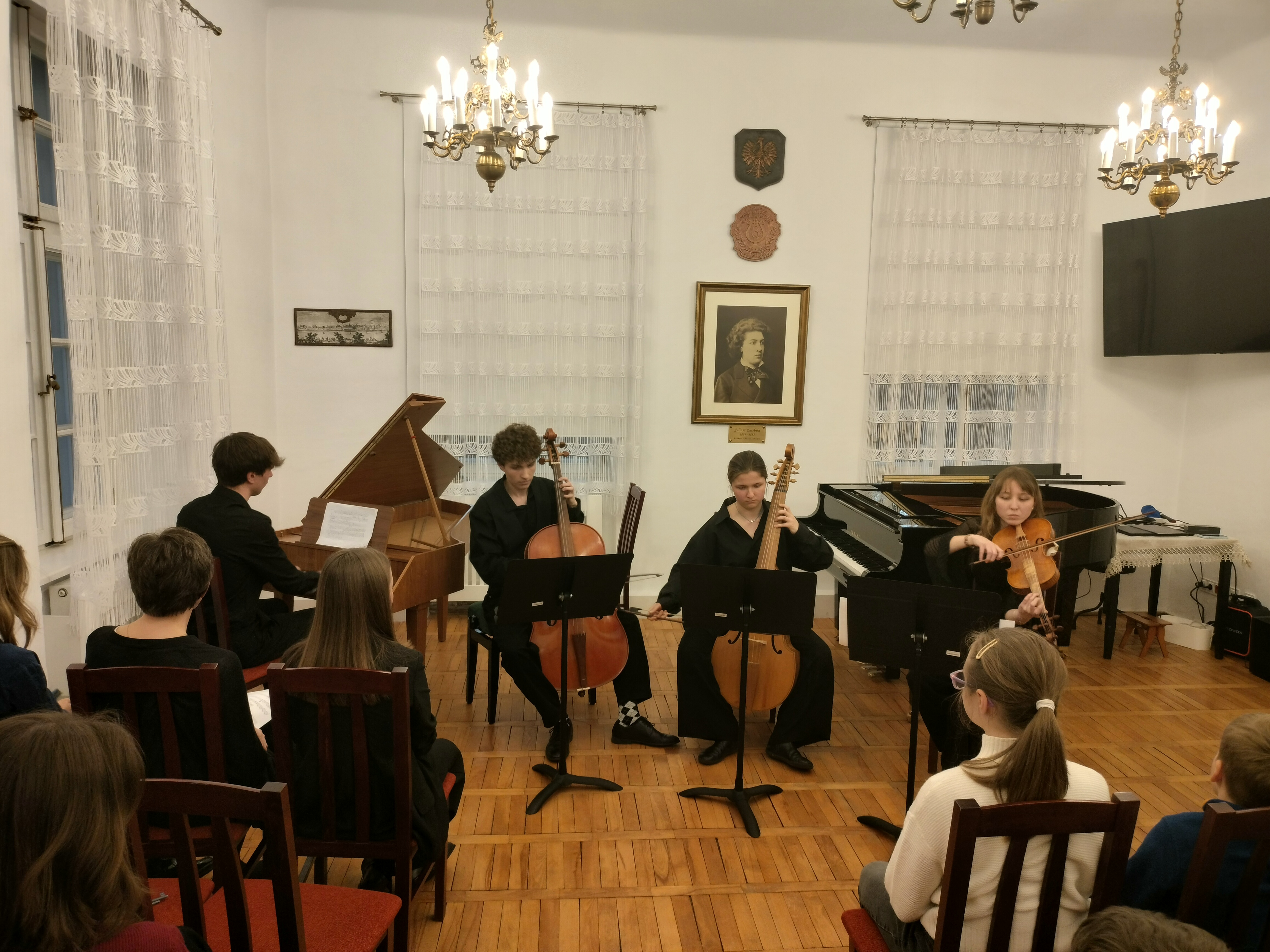 20 marca 2025 r. odbył się w naszej szkole znakomity koncert. Wystąpili uczniowie Zespołu Państwowych Szkół Muzycznych im. F. Chopina w Warszawie (Bednarska). Przyszli do nas, by promować swoją szkołę, pokazać, że można zdecydować się na naukę gry na innym instrument, niż dotychczas, i zachęcić naszych uczniów do zdawania na Bednarską. Wystąpiły zespoły: zespół muzyki dawnej, duet altówkowy, duet gitarowo-akordeonowy oraz soliści: fortepian, obój, śpiew. Ważną częścią koncertu był pokaz uczennic Sekcji Rytmiki - pokazały improwizację i kompozycję fortepianową. Wspaniały pokaz wspólnej improwizacji dała uczennica Bednarskiej i nasz uczeń - Jonasz Koprukowiak z VI klasy. Uczennice średniej szkoły w bardzo wesoły sposób zaprosiły też do muzycznej zabawy wszystkich słuchaczy - co widać na zdjęciach. Wśród wykonawców byli nasi absolwenci: Karol Świerczyński - klawesyn (w naszej szkole uczył się gry na fortepianie), Milena Majewska - altówka barokowa (u nas uczyła się gry na skrzypcach), Teresa Wawryło - obój (u nas fortepian), Szymon Bury - gitara. Koncert poprowadziła p. Katarzyna Tomaszkiewicz.