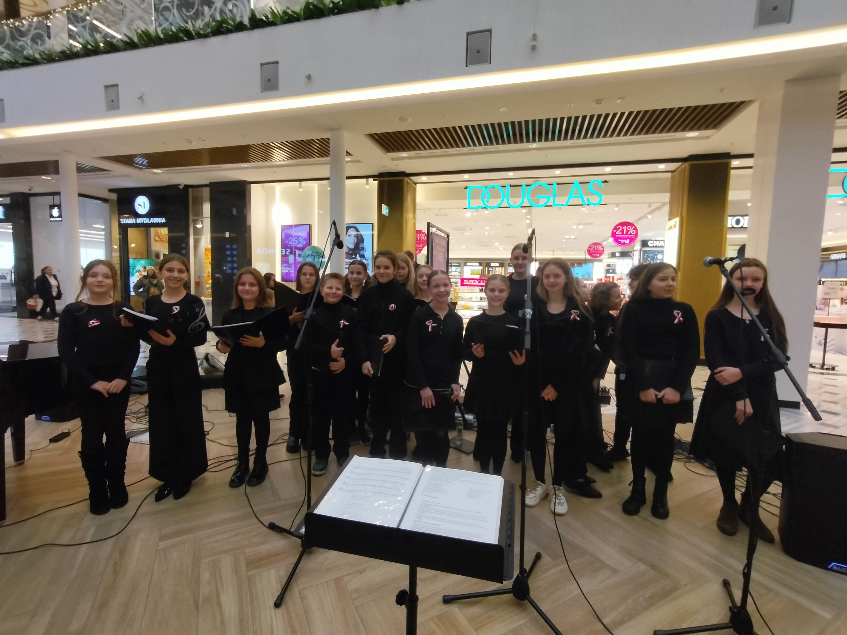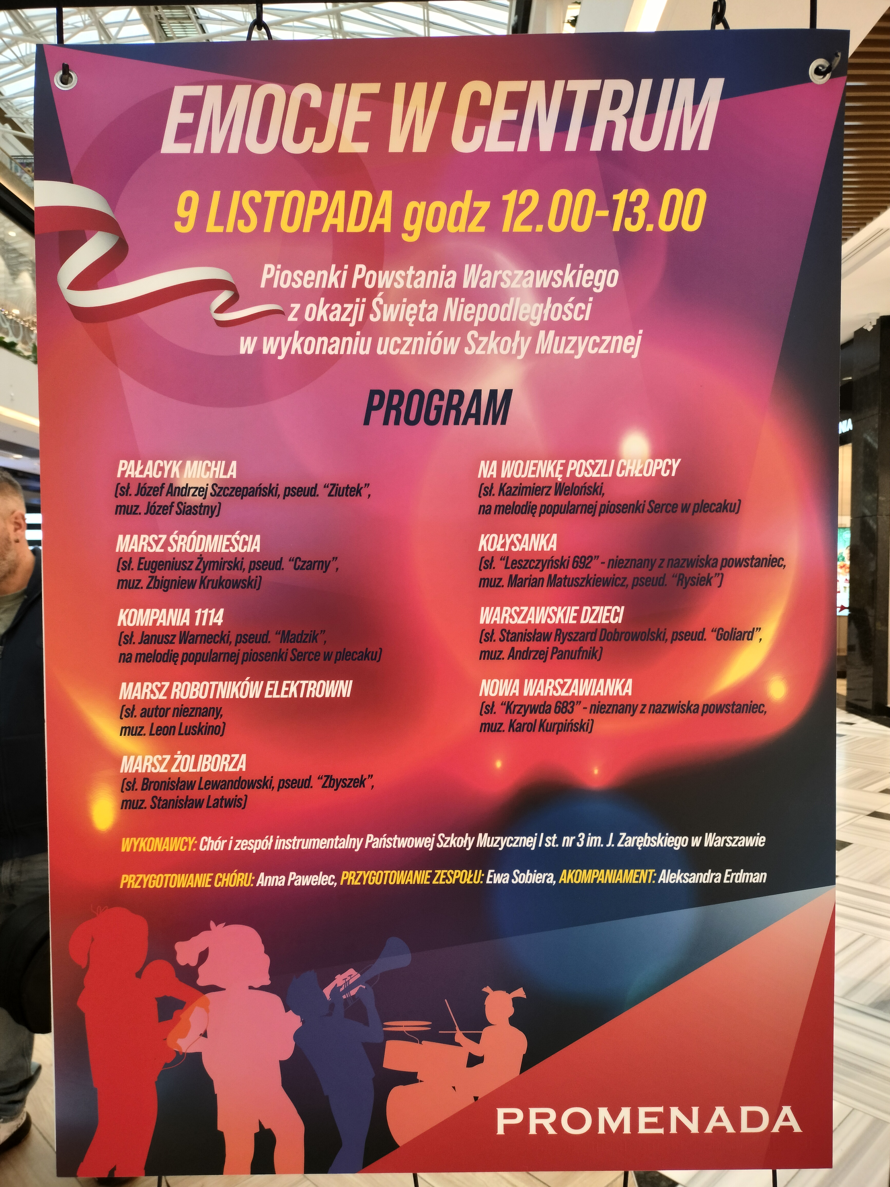 9 października 2024 r. odbył się kolejny koncert w Centrum Handlowym Promenada. Tym razem występ naszych uczniów wpisał się w obchody 80. rocznicy wybuchu Powstania Warszawskiego. Pieśni i piosenki powstańcze zaprezentowały nasze zespoły - chór i zespół smyczkowy. Publiczność entuzjastycznie przyjęła występ.