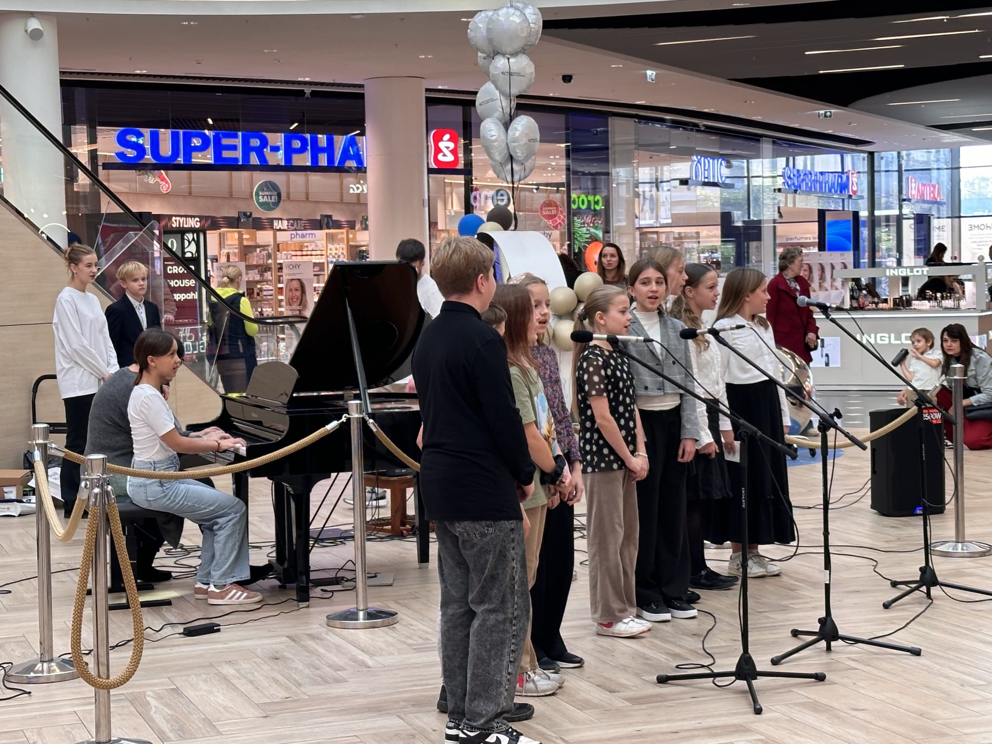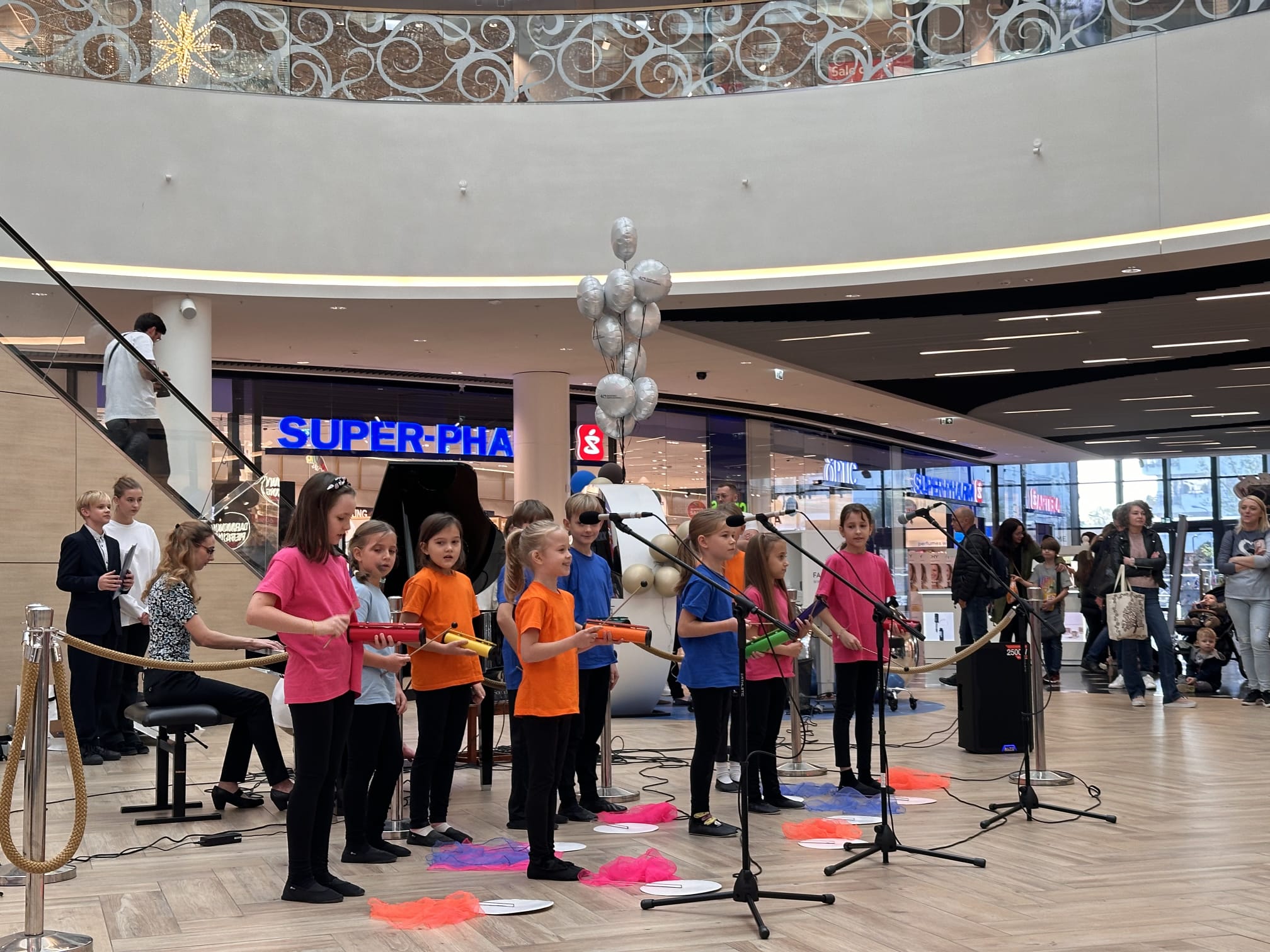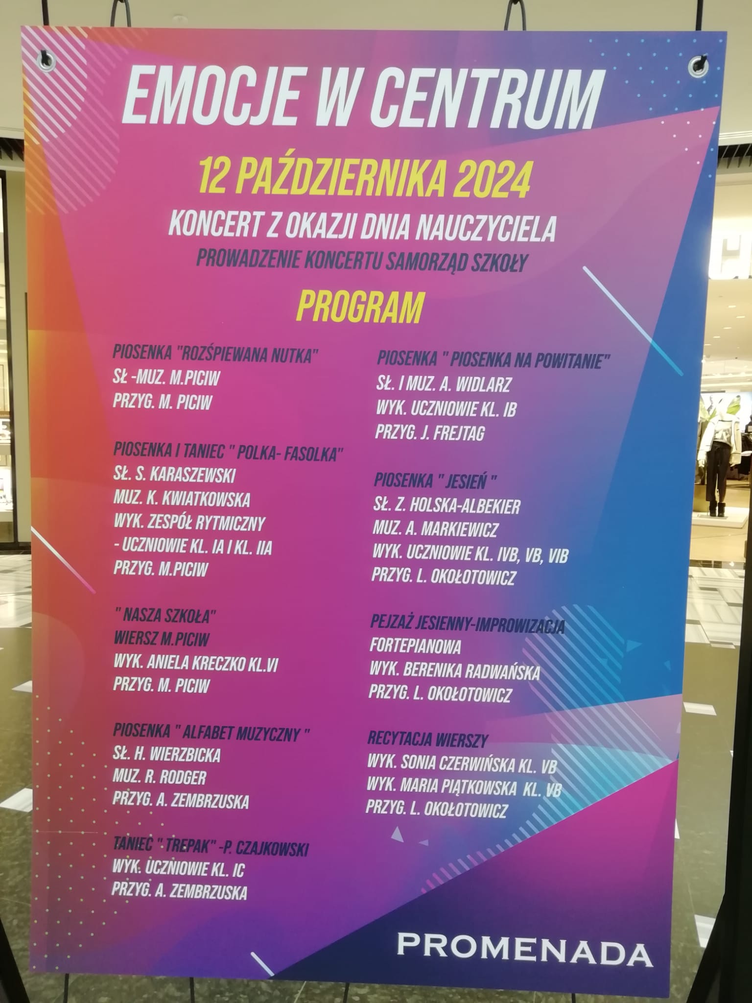 12.10.2024 w Promenadzie odbył się szczególny koncert - z okazji Dnia Nauczyciela wystąpili uczniowie klas pierwszych, wspierani przez starszych kolegów i koleżanki. Licznie zgromadzona publiczność gorącymi oklaskami nagrodziła wszystkie występy. Uczniów klasy I a przygotowała p. Maria Piciw, I b - p. Julia Frejtag, I c - p. Agnieszka Zembrzuska, zaś uczniów klas starszych - p. Lidia Okołotowicz-Rzodkiewicz. Koncert prowadzili przedstawiciele Samorządu Uczniów: Dominika Horbaj i Stanisław Sobiera z kl. VI.
