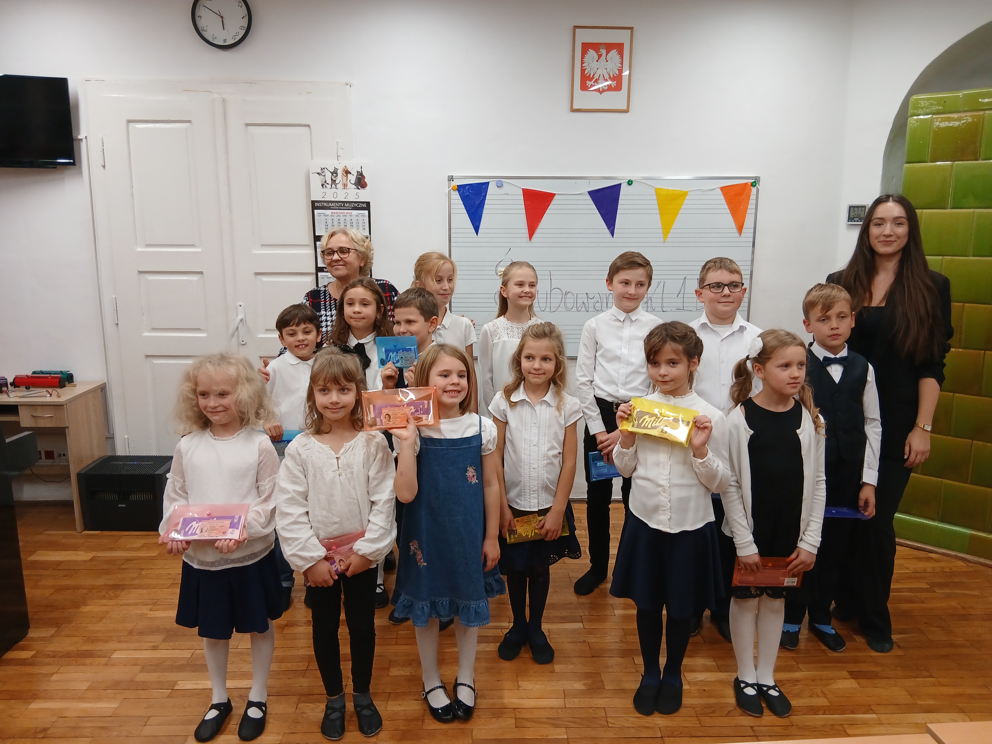 Uroczystość ślubowania klasy I b (nauczyciel - p. Julia Frejtag) - pierwszoklasiści przedstawili piękny program artystyczny; słowa ślubowania dzieci powtarzały za p. Dyrektor Grażyną Radkowską. Nie obyło się bez słodkiego upominku :-)