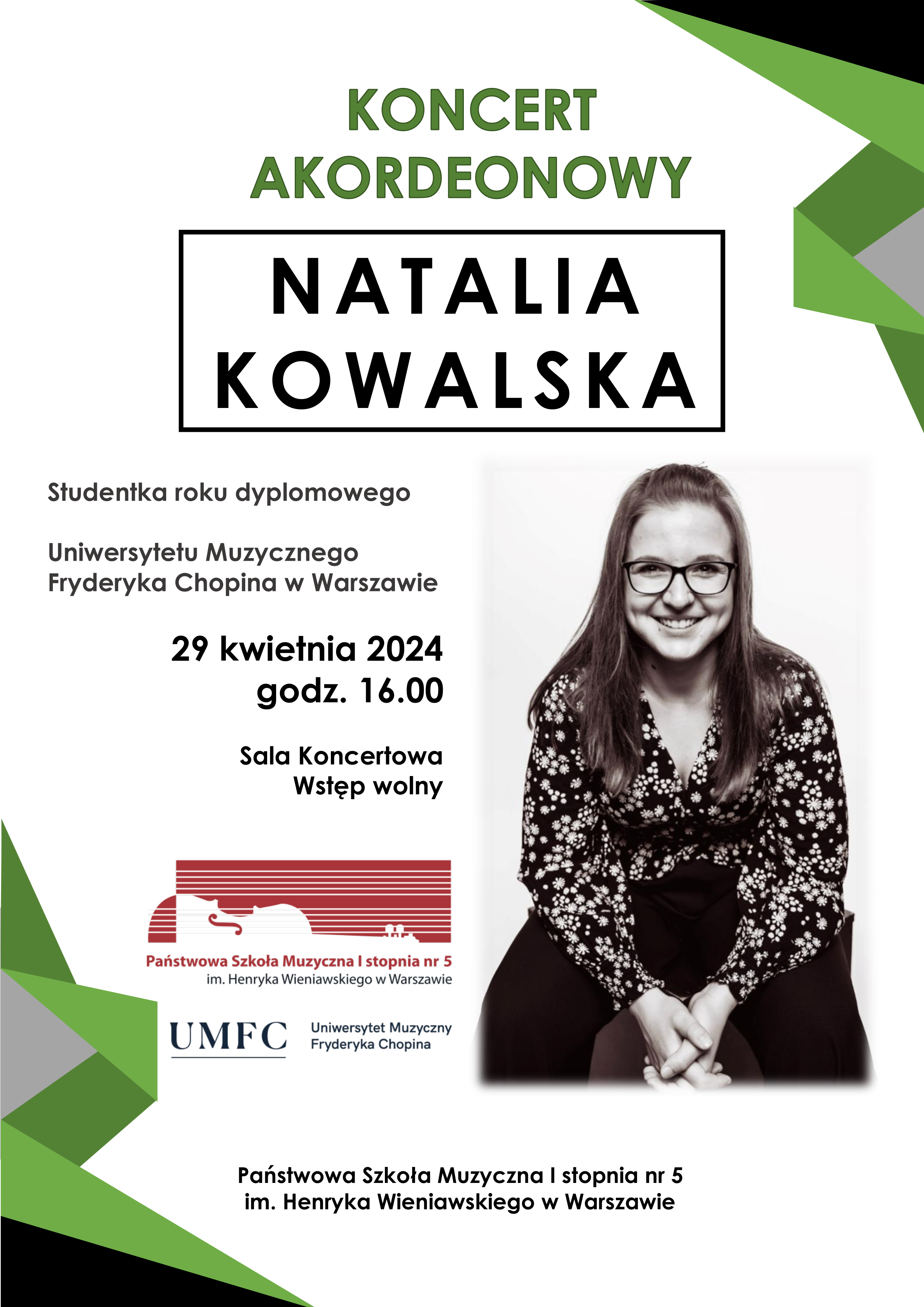 29 kwietnia 2024 r. (poniedziałek) o godz. 16.00 w Sali Koncertowej wystąpi akordeonistka Natalia Kowalska - studentka roku dyplomowego w klasie prof. dr hab. Klaudiusza Barana na Uniwersytecie Muzycznym Fryderyka Chopina w Warszawie. Artystka jest laureatką wielu nagród na ogólnopolskich i międzynarodowych konkursach muzycznych.