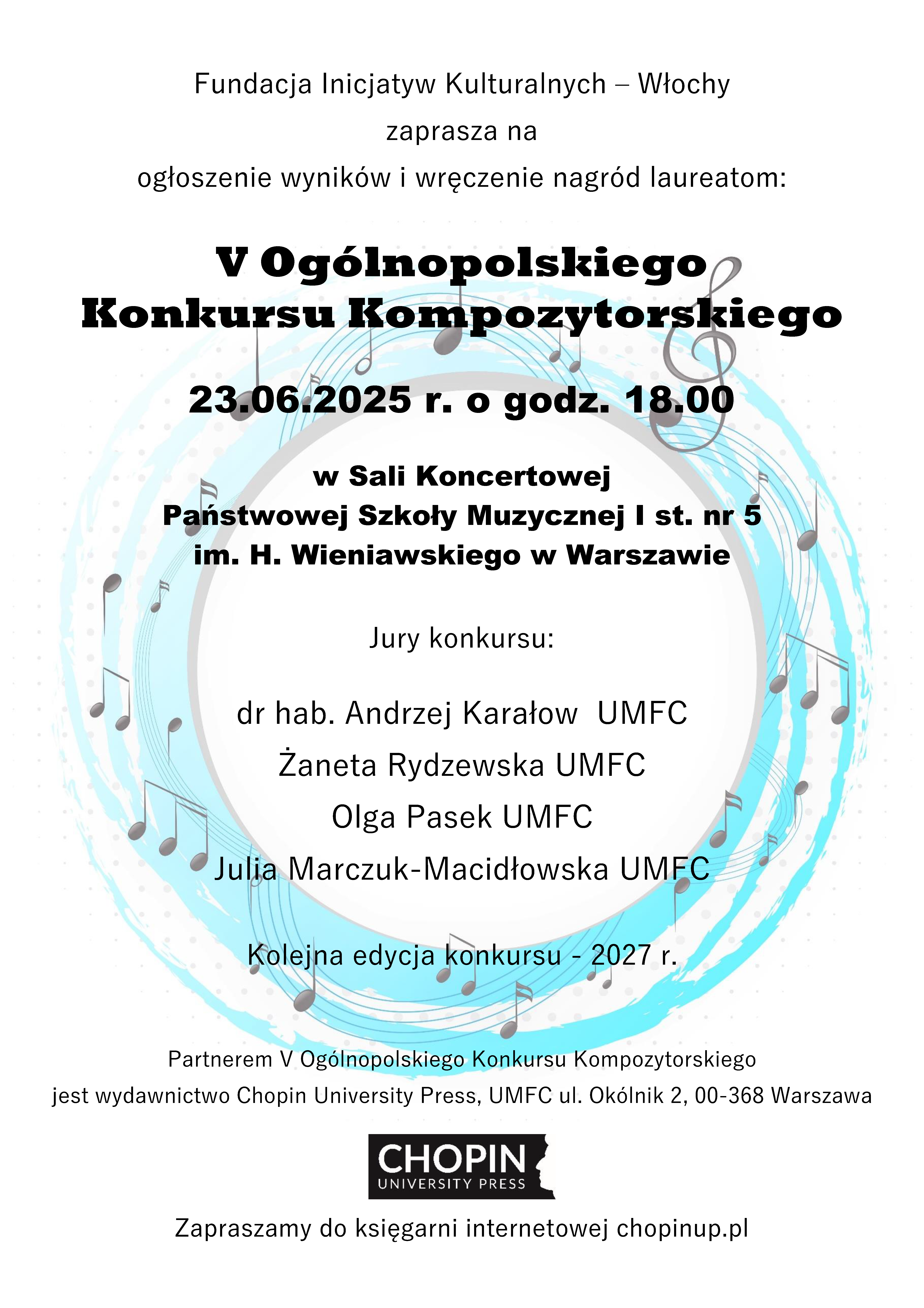 Partnerem V Ogólnopolskiego Konkursu Kompozytorskiego jest wydawnictwo Chopin University Press.