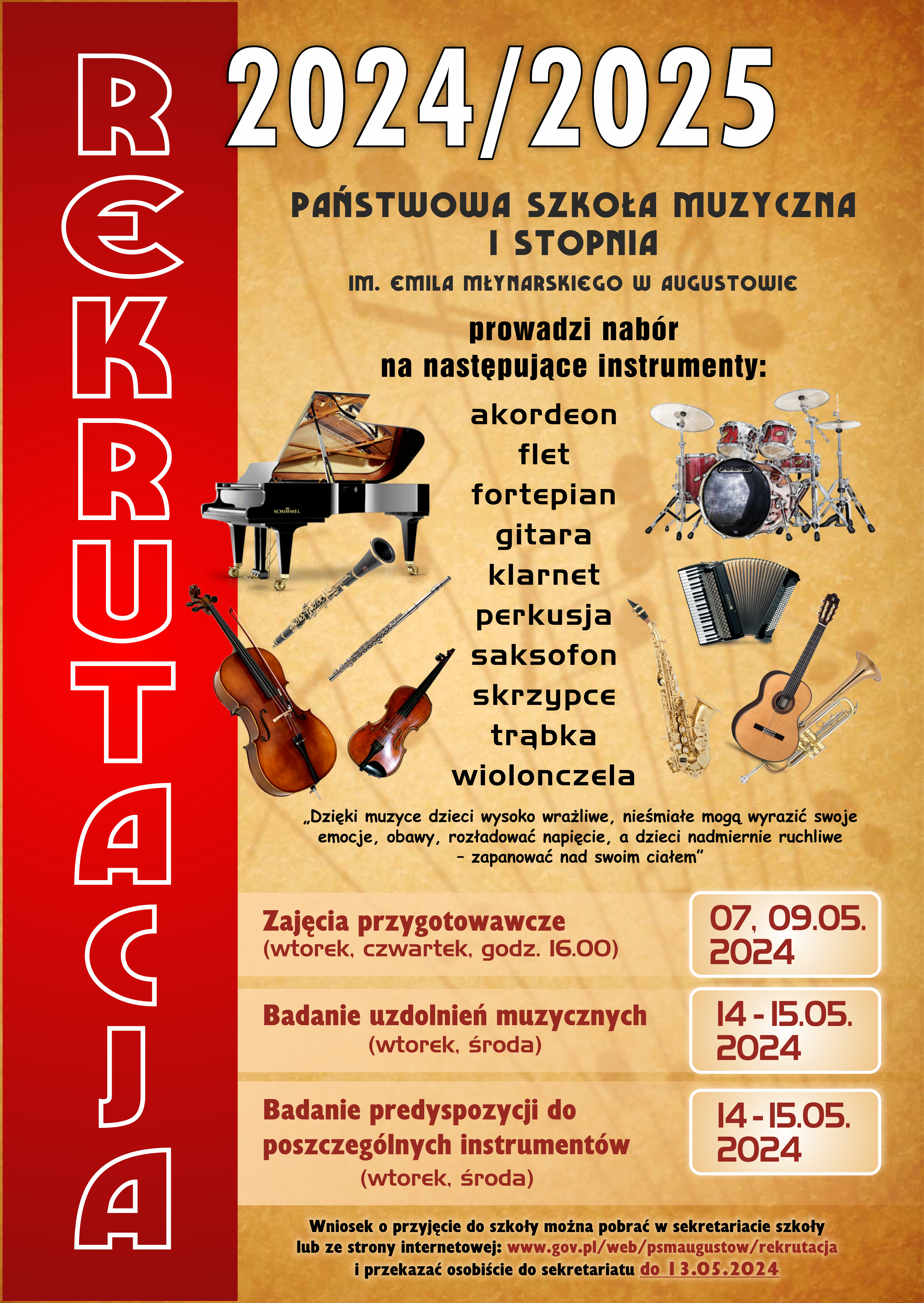 Państwowa Szkoła Muzyczna I stopnia im. Emila Młynarskiego w Augustowie przeprowadza rekrutację kandydatów do klas pierwszych: