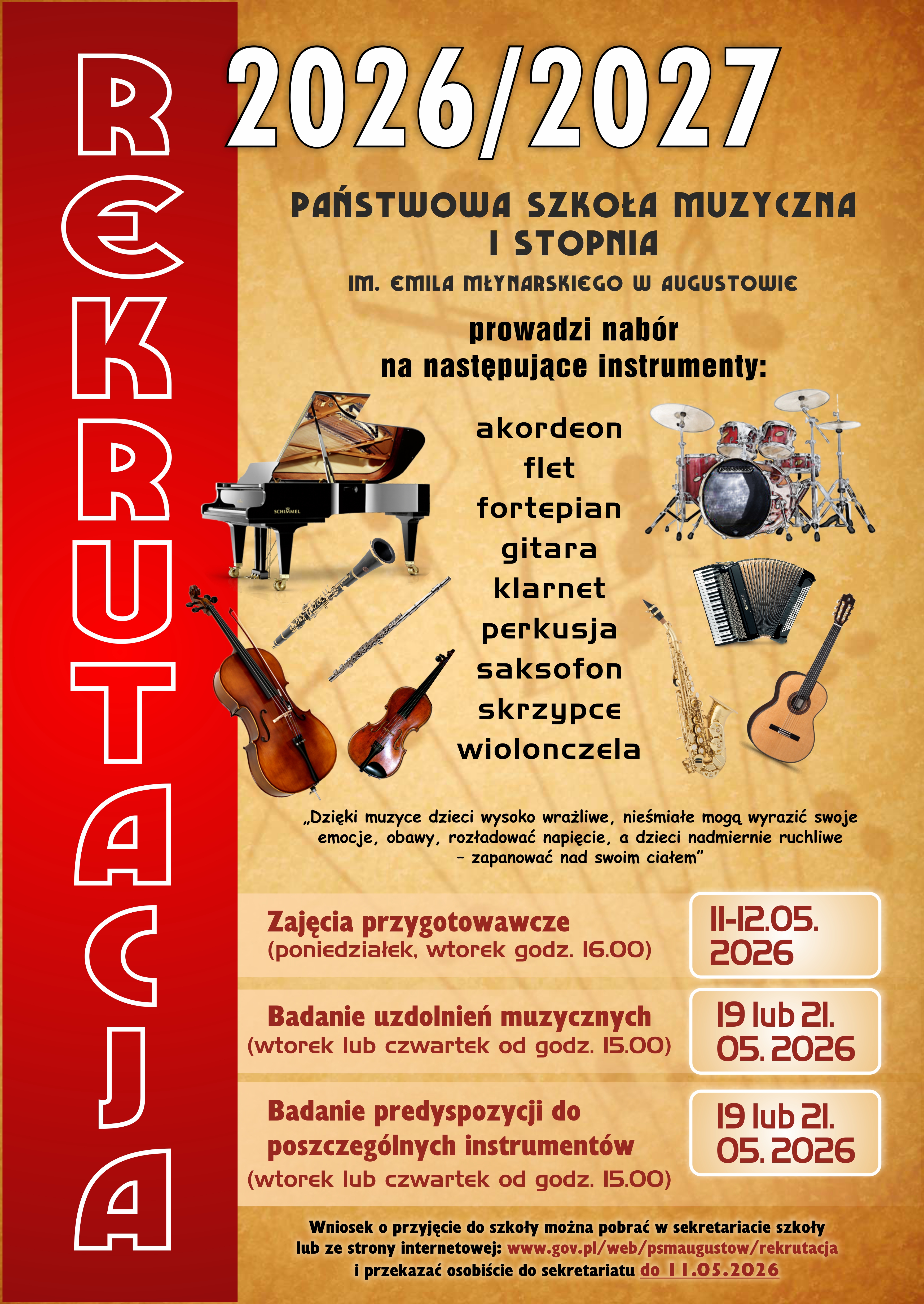 Państwowa Szkoła Muzyczna I stopnia im. Emila Młynarskiego w Augustowie przeprowadza rekrutację kandydatów do klas pierwszych: