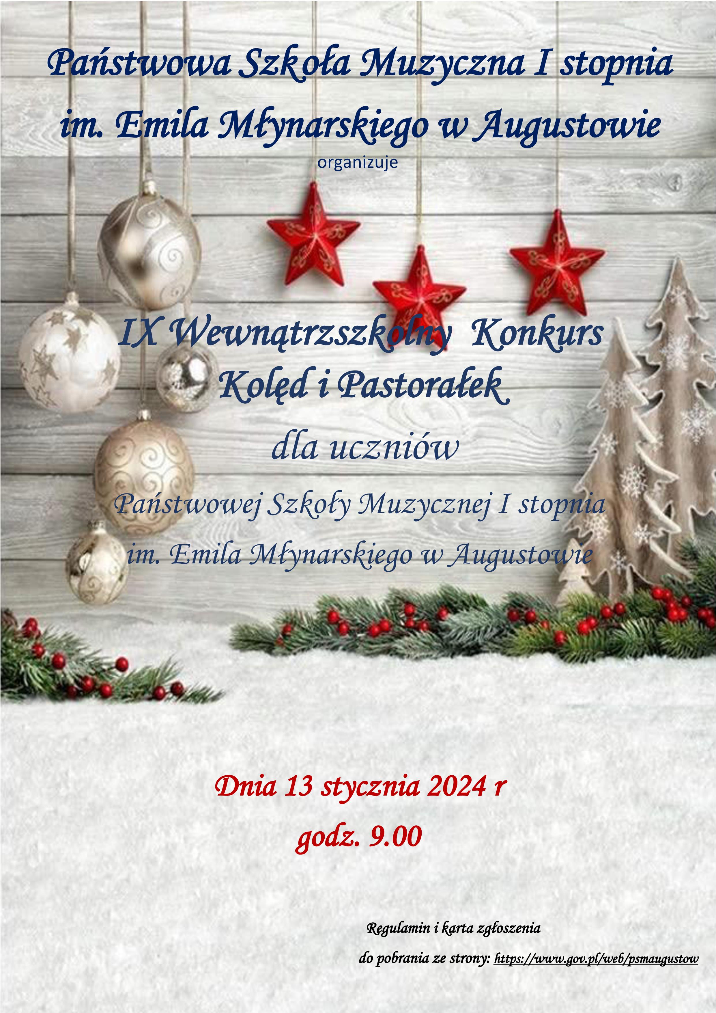 Regulamin IX Konkursu Kolęd i PastorałekPSM_Augustów_Konkurs_Kolęd_Regulamin_2024.pdf 0.15MB Regulamin IX Konkursu Kolęd i Pastorałek