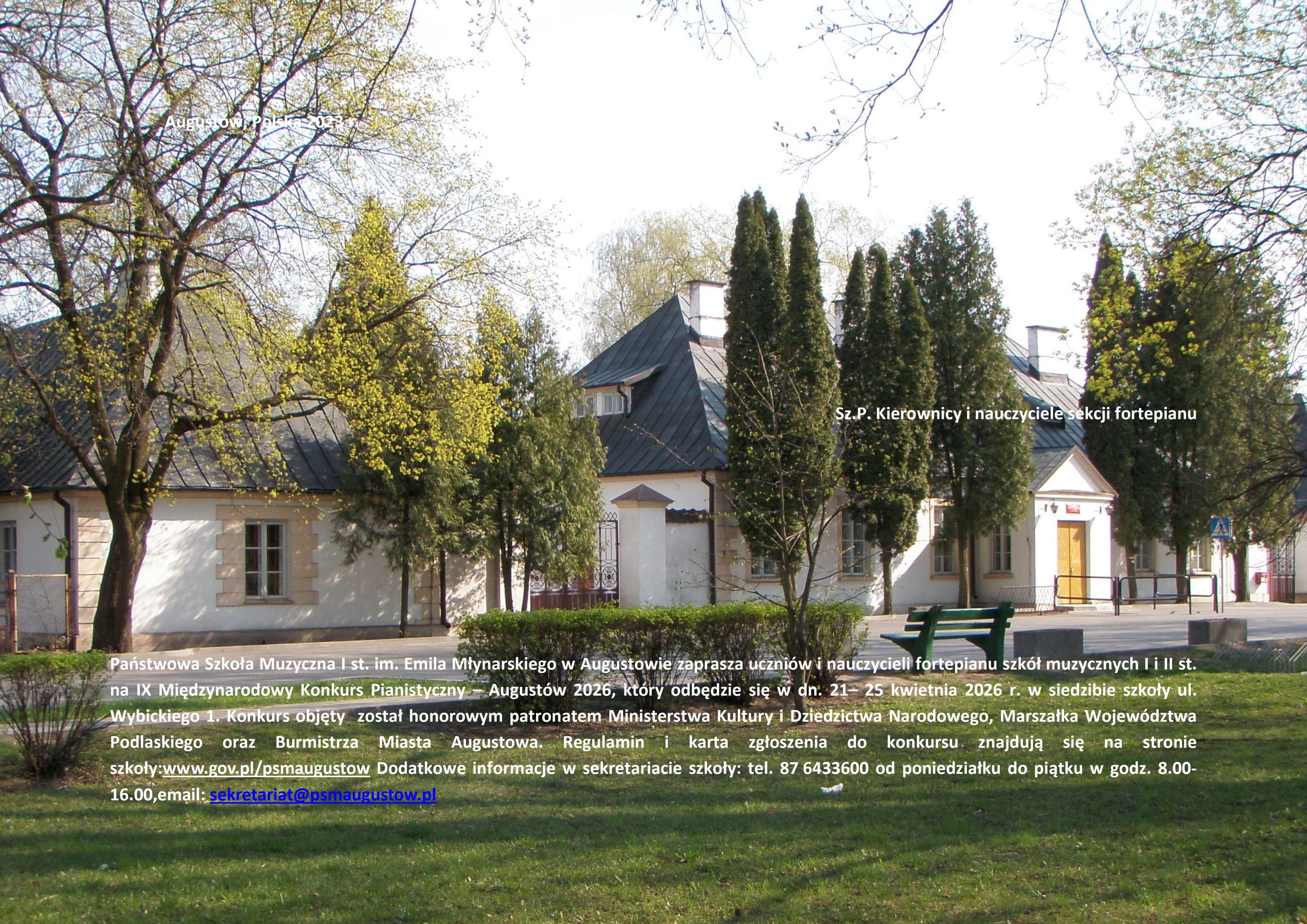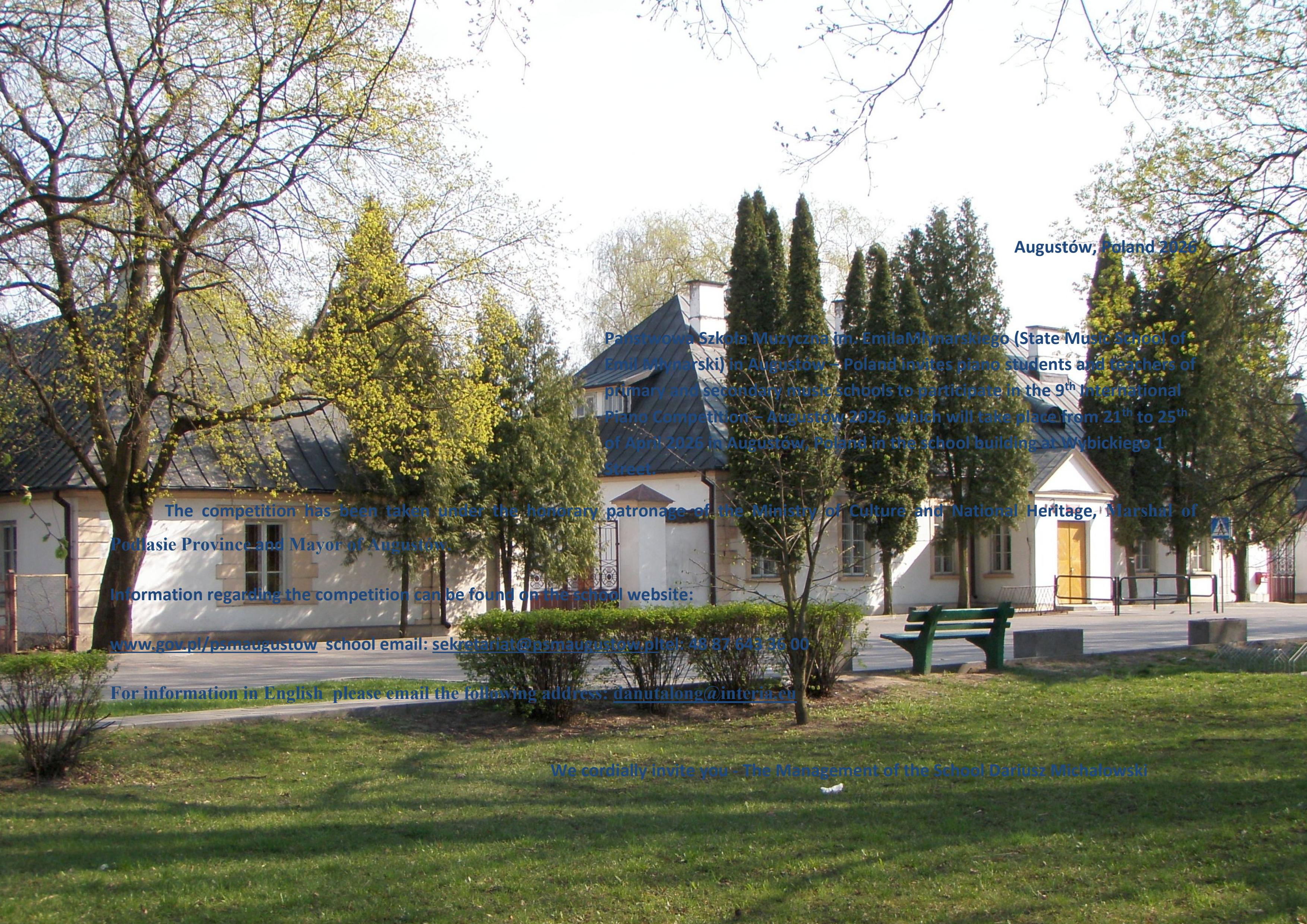 Państwowa Szkoła Muzyczna I st. im. Emila Młynarskiego w Augustowie zaprasza uczniów i nauczycieli fortepianu szkół muzycznych I i II st. na IX Międzynarodowy Konkurs Pianistyczny – Augustów 2026, który odbędzie się w dn. 21– 25 kwietnia 2026 r. w siedzibie szkoły ul. Wybickiego 1. Konkurs objęty został honorowym patronatem Ministerstwa Kultury i Dziedzictwa Narodowego, Marszałka Województwa Podlaskiego oraz Burmistrza Miasta Augustowa. Regulamin i karta zgłoszenia do konkursu znajdują się na stronie szkoły:www.gov.pl/psmaugustow Dodatkowe informacje w sekretariacie szkoły: tel. 87 6433600 od poniedziałku do piątku w godz. 8.00-16.00,email: sekretariat@psmaugustow.pl
