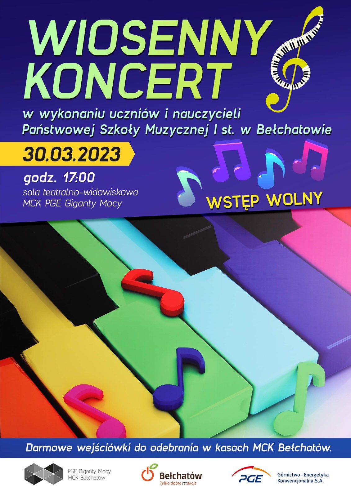 Serdecznie zapraszamy na Koncert Wiosenny w wykonaniu uczniów oraz nauczycieli Państwowej Szkoły Muzycznej I stopnia w Bełchatowie. Koncert odbędzie się 30 marca 2023 r. o godz. 17:00 w Sali Teatralno-Widowiskowej MCK PGE Giganty Mocy. Wstęp wolny, bezpłatne bilety - wejściówki można odebrać w kasie biletowej Miejskiego Centrum Kultury w Bełchatowie. Wejściówki dla uczniów i rodziców zostaną przekazane przez nauczycieli w szkole.