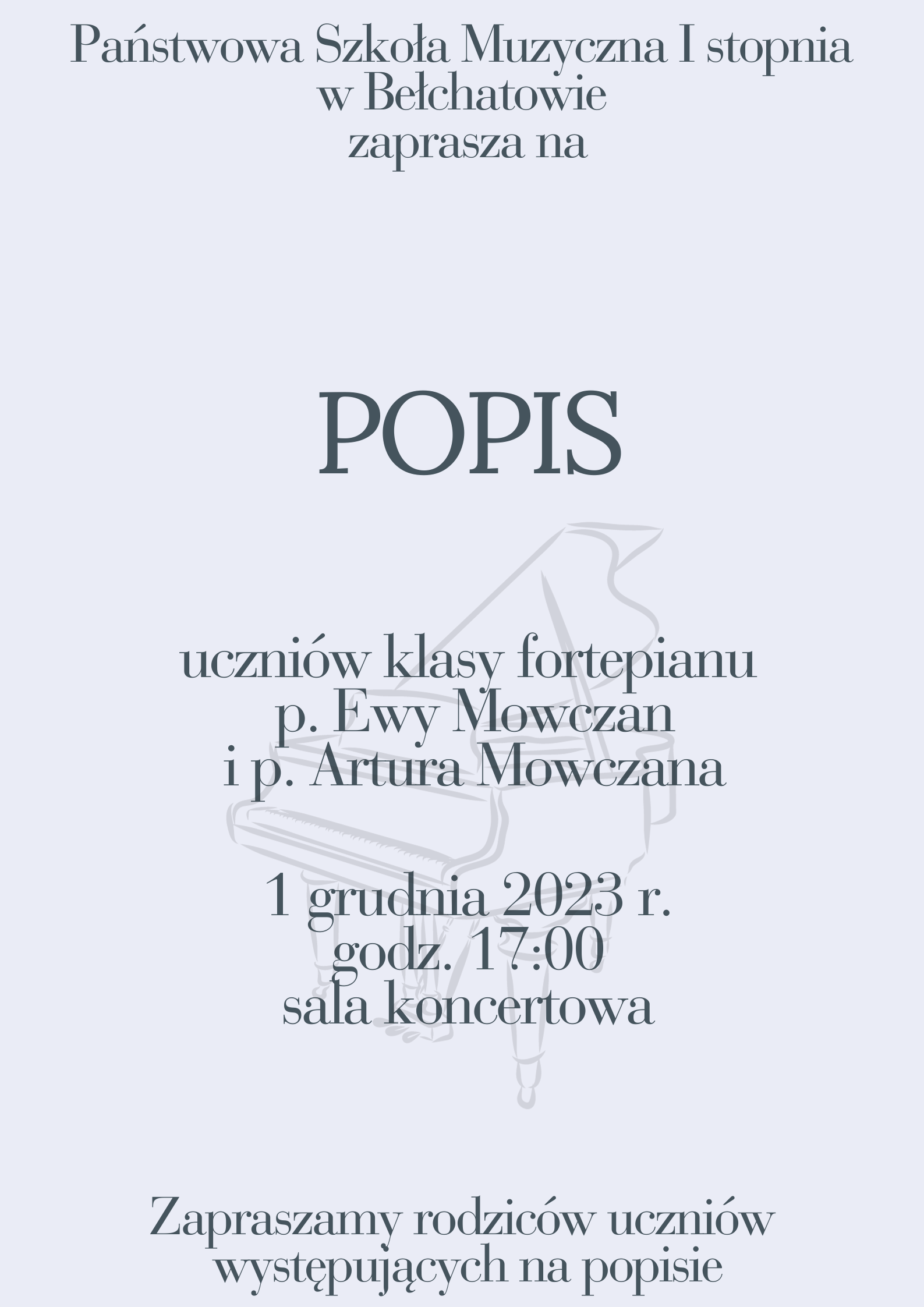 Serdecznie zapraszamy uczniów oraz rodziców na popis w wykonaniu uczniów klas fortepianu pani Ewy Mowczan i pana Artura Mowczana. Popis odbędzie się 1 grudnia 2023 r. o godzinie 17:00 w sali koncertowej Państwowej Szkoły Muzycznej I stopnia w Bełchatowie.