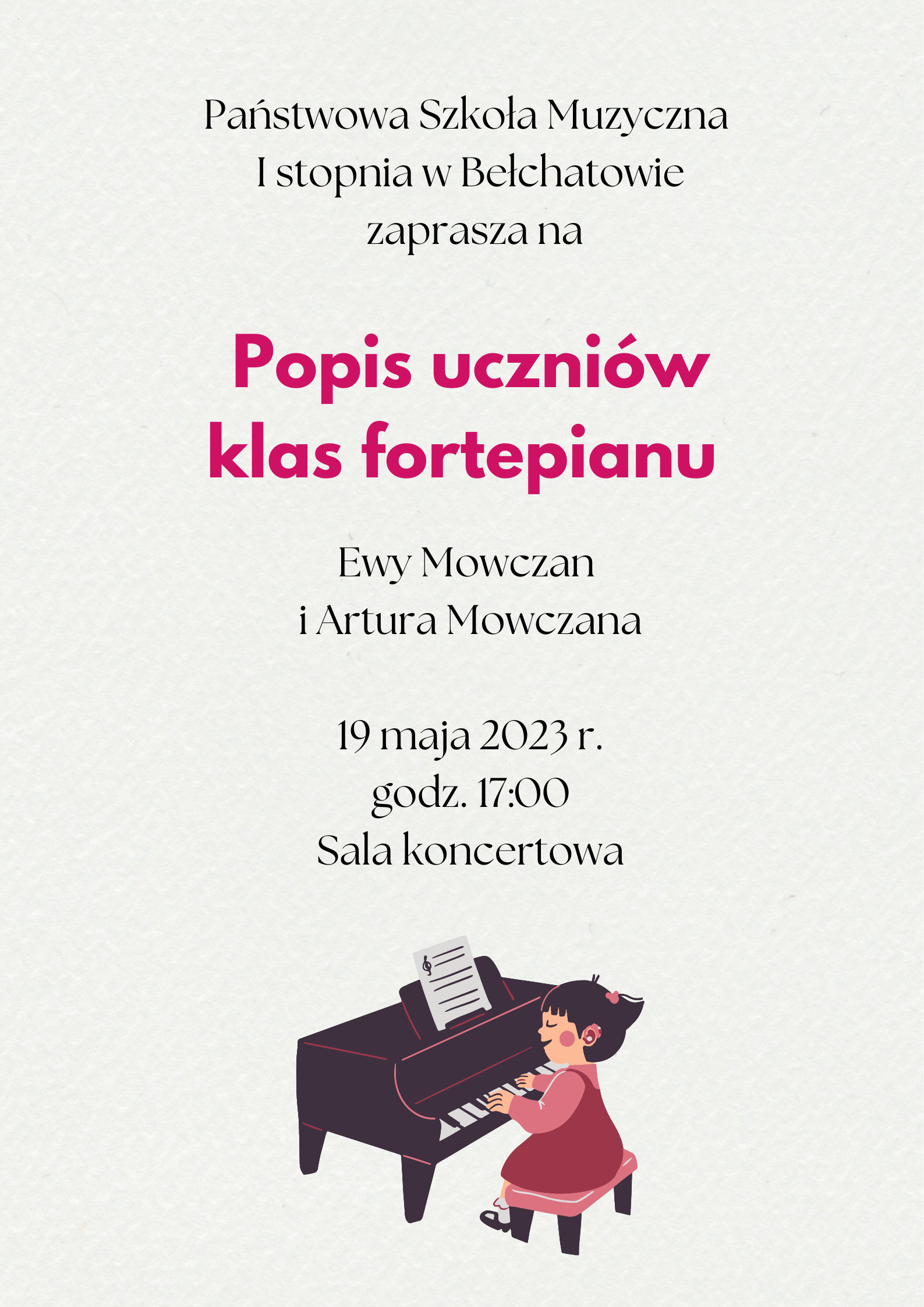 Serdecznie zapraszamy uczniów i rodziców na popis uczniów klas fortepianu pani Ewy Mowczan i pana Artura Mowczana, który odbędzie się 19 maja 2023 r. o godzinie 17:00 w sali koncertowej Państwowej Szkoły Muzycznej I stopnia w Bełchatowie.