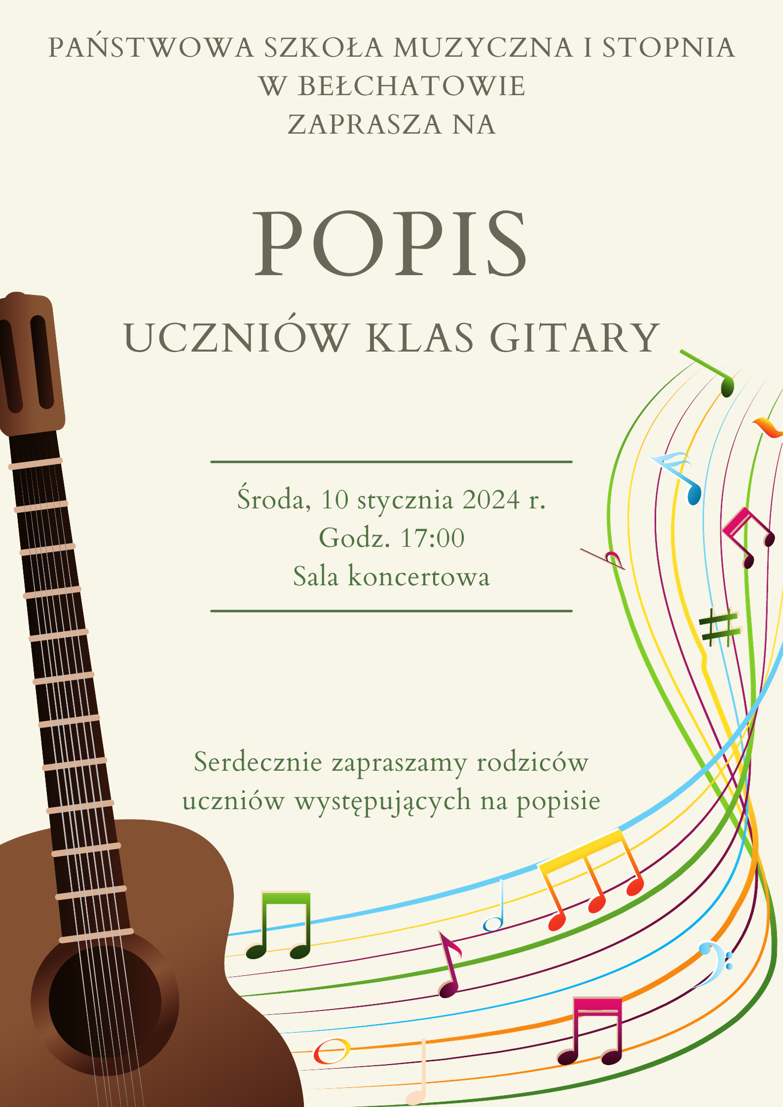 Serdecznie zapraszamy na popis uczniów klas gitary, który odbędzie się 10 stycznia 2024 r. w sali koncertowej Państwowej Szkoły Muzycznej I stopnia w Bełchatowie.
