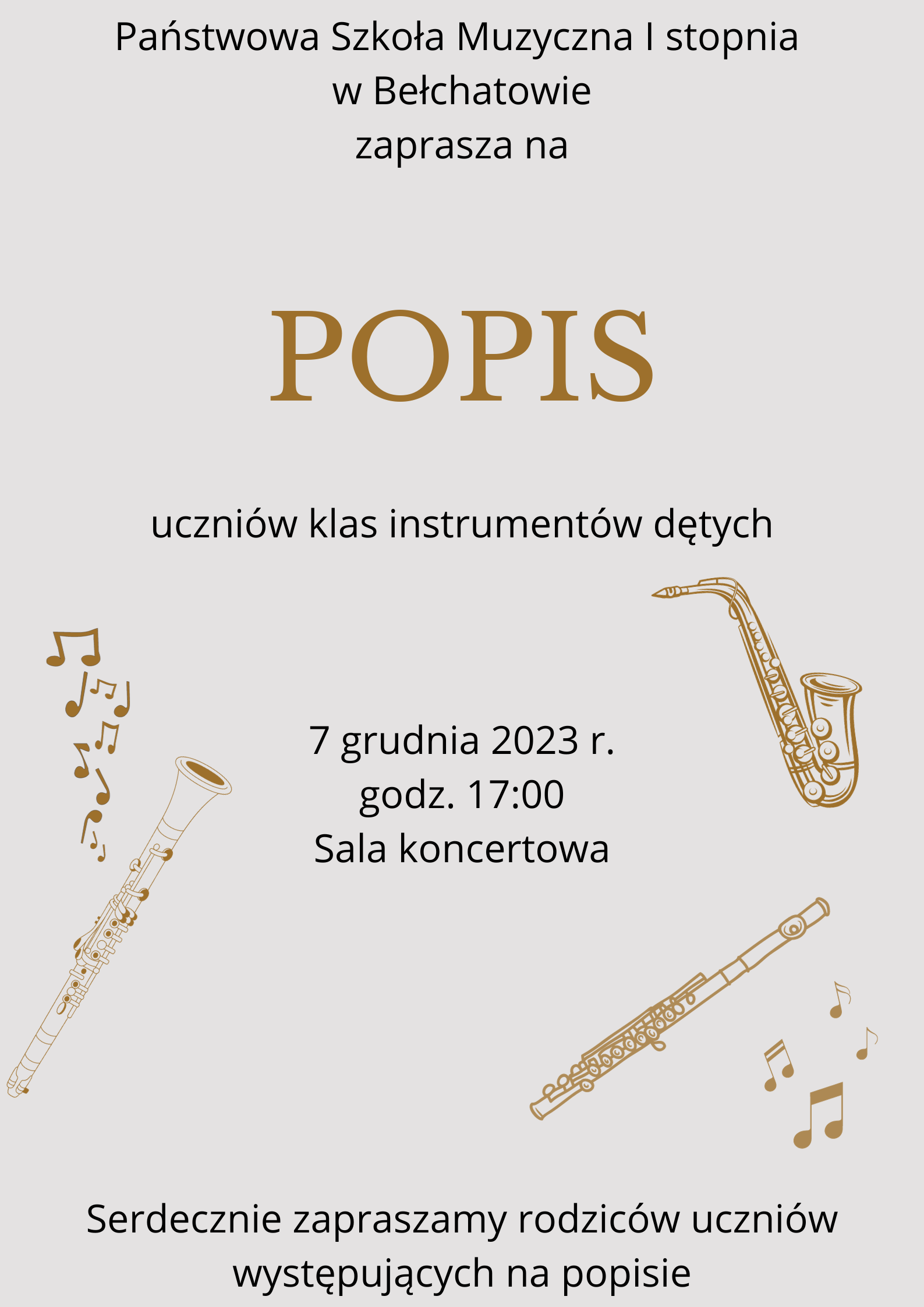 Serdecznie zapraszamy uczniów oraz rodziców na popis uczniów klas instrumentów dętych. Swoje umiejętności zaprezentują uczniowie klas: klarnetu, fletu poprzecznego oraz saksofonu. Popis odbędzie się 7 grudnia 2023 r. o godzinie 17:00 w sali koncertowej Państwowej Szkoły Muzycznej I stopnia w Bełchatowie.