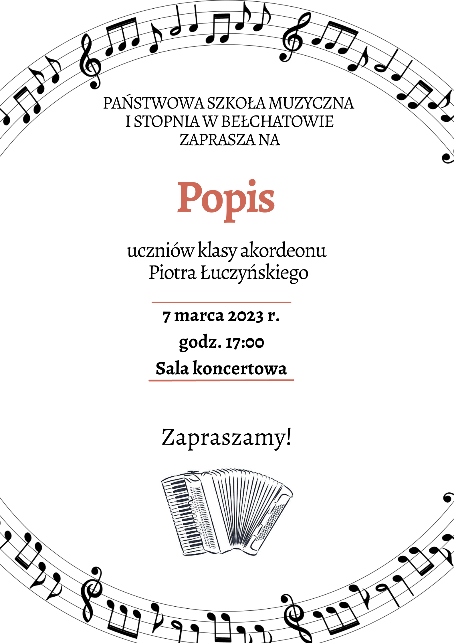 Serdecznie zapraszamy uczniów oraz rodziców na popis klasy akordeonu pana Piotra Łuczyńskiego, który odbędzie się 7 marca 2023 r. w sali koncertowej Państwowej Szkoły Muzycznej I stopnia w Bełchatowie.
