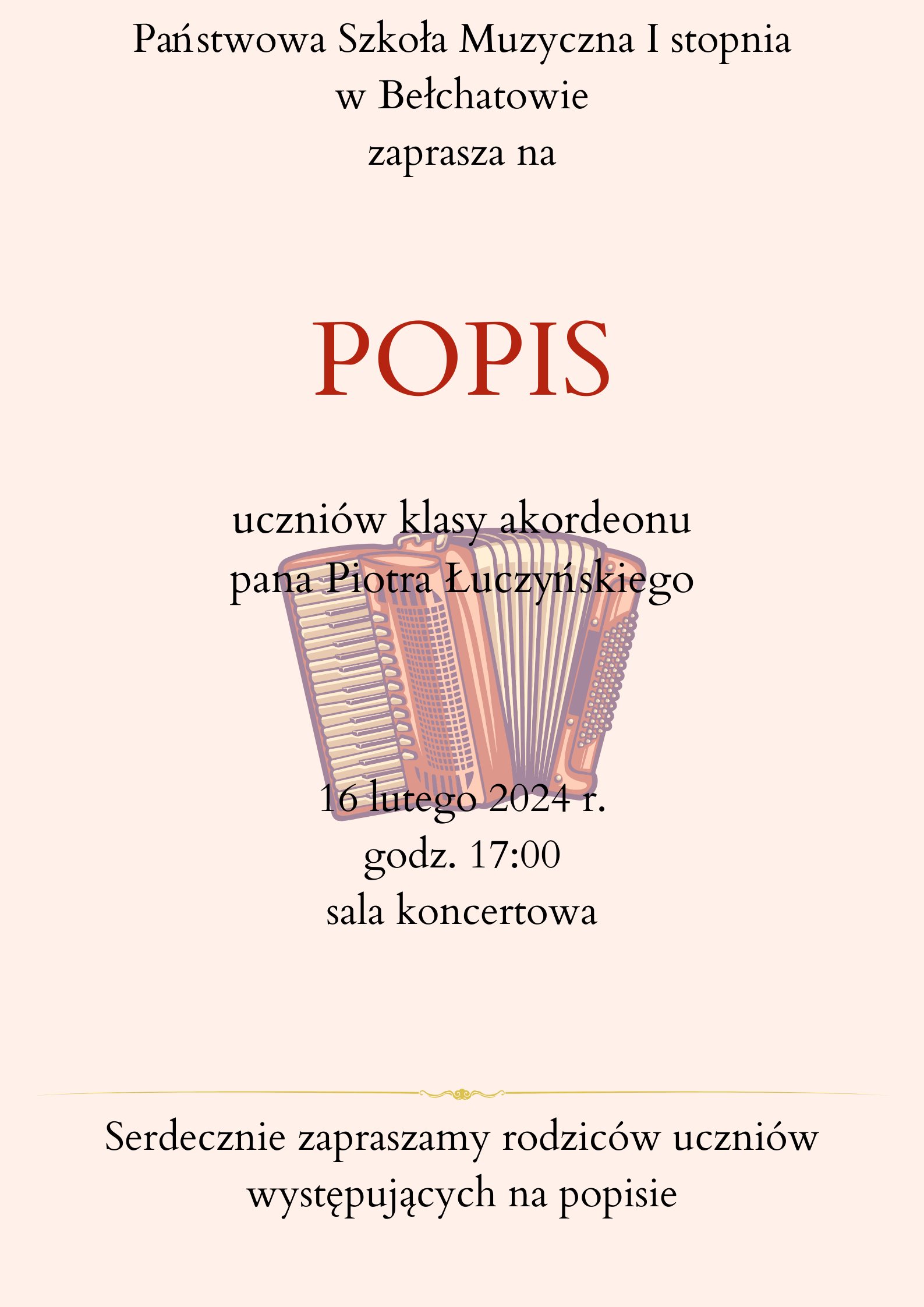 Serdecznie zapraszamy na popis uczniów klasy akordeonu pana Piotra Łuczyńskiego, który odbędzie się 16 lutego 2024 r. o godzinie 17:00 w sali koncertowej Państwowej Szkoły Muzycznej I stopnia w Bełchatowie.