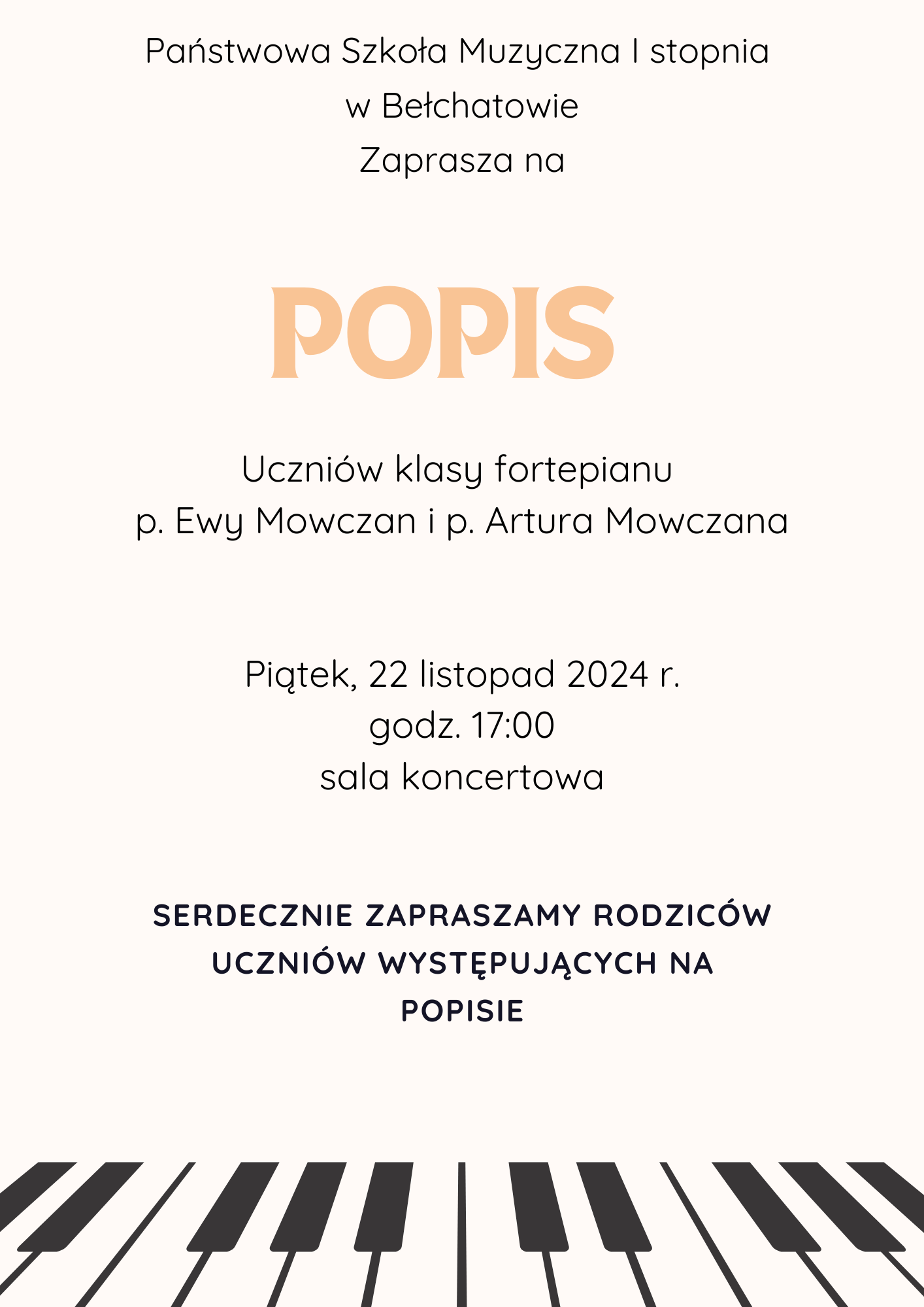 Serdecznie zapraszamy rodziców na popis uczniów klasy fortepianu p. Ewy Mowczan i p. Artura Mowczana, który odbędzie się 22 listopada 2024 r. o godzinie 17:00 w sali koncertowej Państwowej Szkoły Muzycznej I stopnia w Bełchatowie.