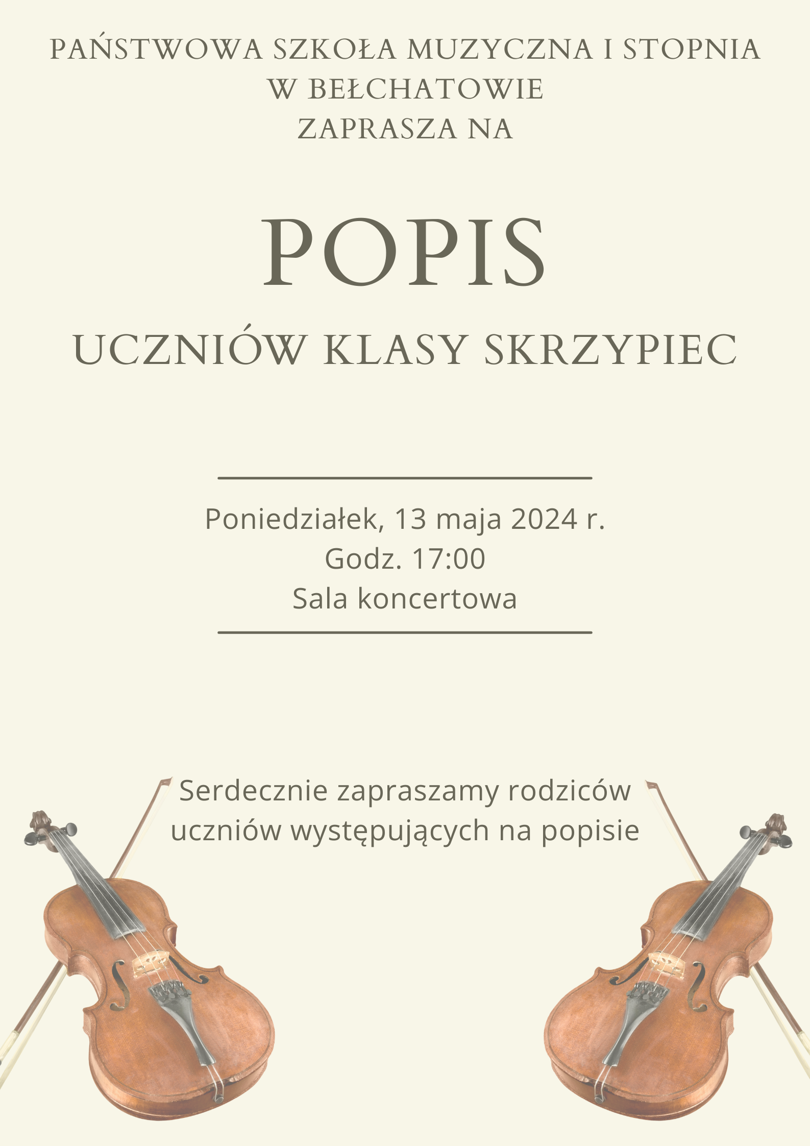 Serdecznie zapraszamy na popis uczniów klasy skrzypiec pani Jolanty Bartoszek, który odbędzie się 13 maja 2024 r. o godzinie 17:00 w sali koncertowej Państwowej Szkoły Muzycznej I stopnia w Bełchatowie.