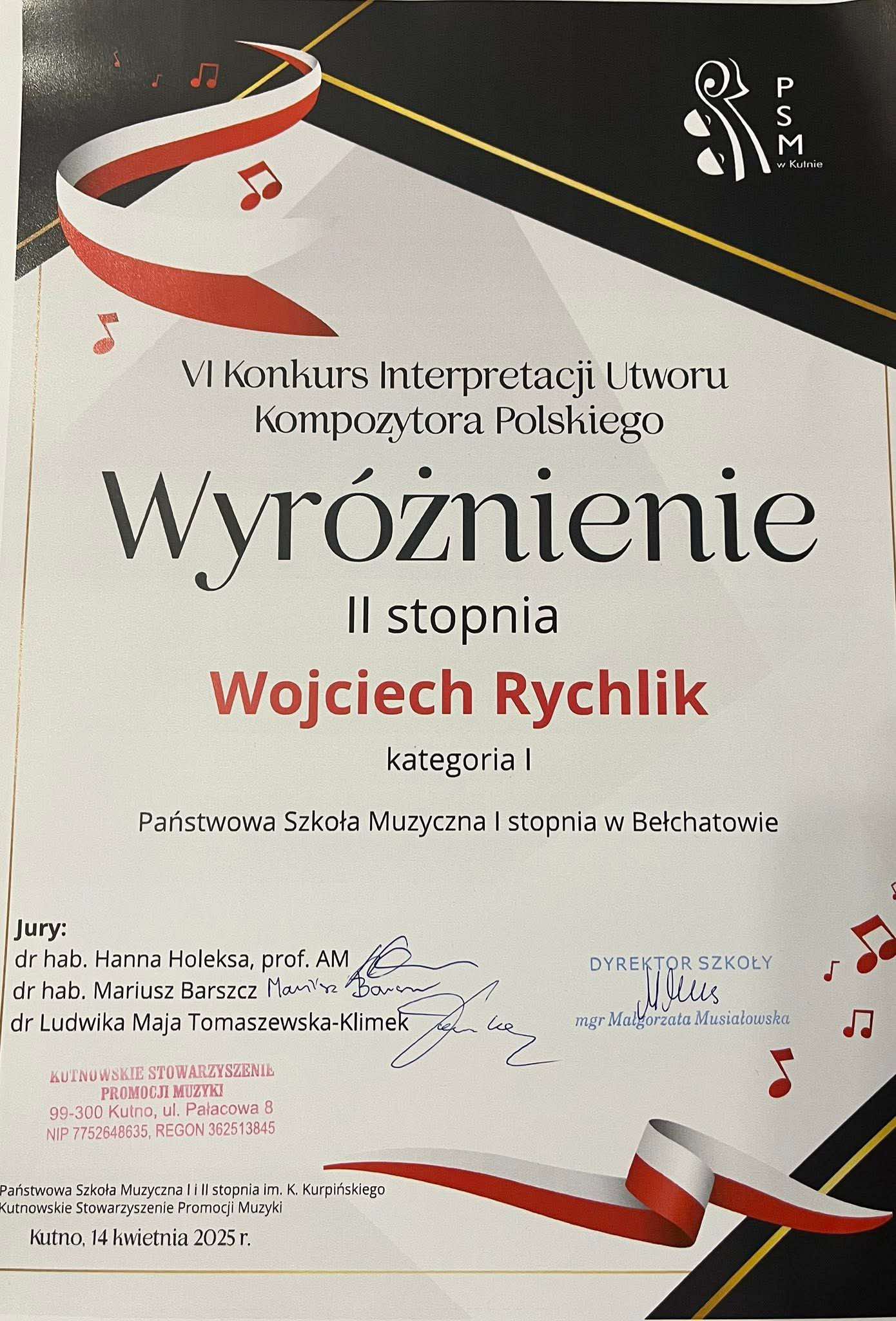 14 kwietnia 2025 roku uczeń klasy gitary Wojciech Rychlik przygotowany przez pana Marka Węgrzynka zdobył Wyróżnienie w kategorii I na VI Konkursie Interpretacji Utworu Kompozytora Polskiego w państwowej Szkole Muzycznej I i II stopnia im. Karola Kurpińskiego w Kutnie.
