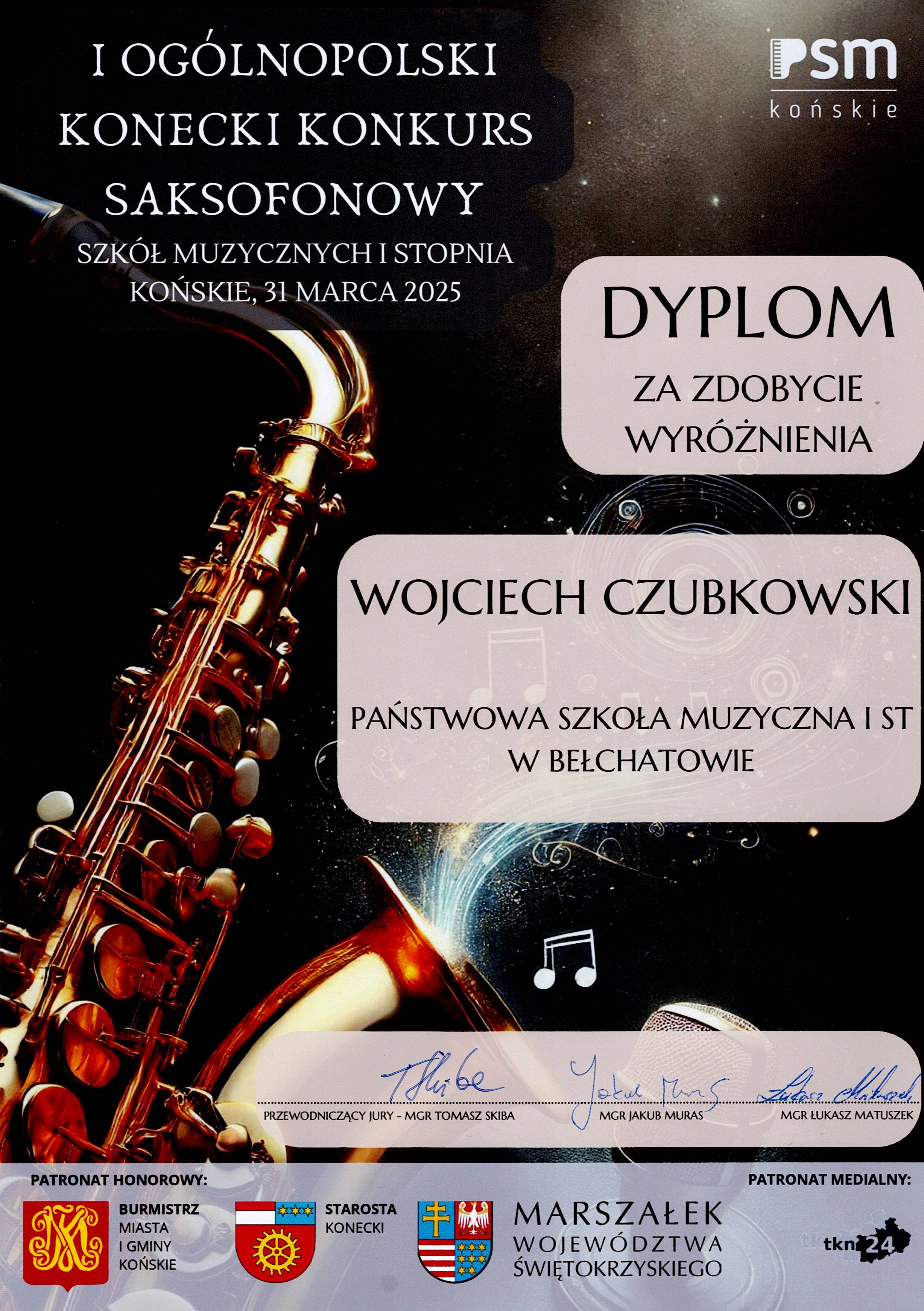 31 marca 2025 roku uczeń klasy saksofonu Wojciech Czubkowski przygotowany przez pana Adama Wojtasika zdobył Wyróżnienie na I Ogólnopolskim Koneckim Konkursie Saksofonowym w Państwowej Szkole Muzycznej I stopnia w Końskich.
